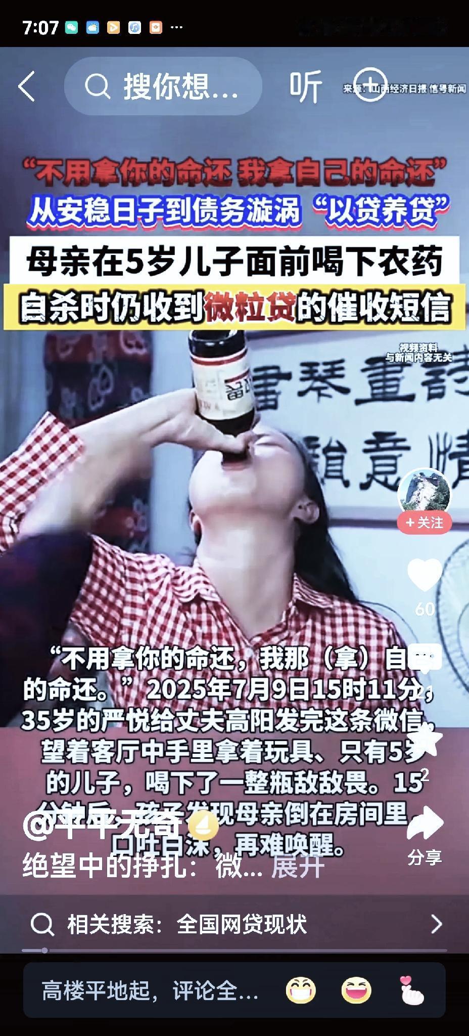 一则播放量超6000次的“微粒贷催收逼疯母亲”视频,近期在网络引发强烈共鸣,揭开了普通家庭在暴力催收阴影下的无助困境。 据悉,当事人母亲为缓解生活压力使用微粒贷后产生欠款,不料陷入高频次、无昼夜的催收漩涡——骚扰电话不断、言语威胁升级,甚至亲友也被牵连,最终导致这位母亲精神状态彻底崩溃,在绝望中艰难挣扎。 网贷的诞生本是为了给用户提供便捷的金融服务,弥补传统金融的空白。但暴力催收的出现,却让这份便捷变了味,不仅严重侵犯了借款人及家人的合法权益,扰乱正常生活秩序,更暗藏引发极端事件的风险,完全逾越了法律与道德的双重底线。 事实上,监管部门早已对暴力催收亮明红灯,明令禁止各类违规催收行为。作为金融平台,微粒贷所属机构理应严格落实监管要求,规范催收流程,给予借款人合理的还款缓冲期与人性化沟通空间,而非以极端方式施压。 此事也为广大消费者敲响警钟:借贷需秉持量力而行的原则,谨慎选择合规经营的金融平台,避免陷入债务困境。同时,期待相关平台能正视催收乱象,以彻底的整改行动加强内部监管,让金融服务真正回归便民初心,不再成为伤害普通人的“利刃”。