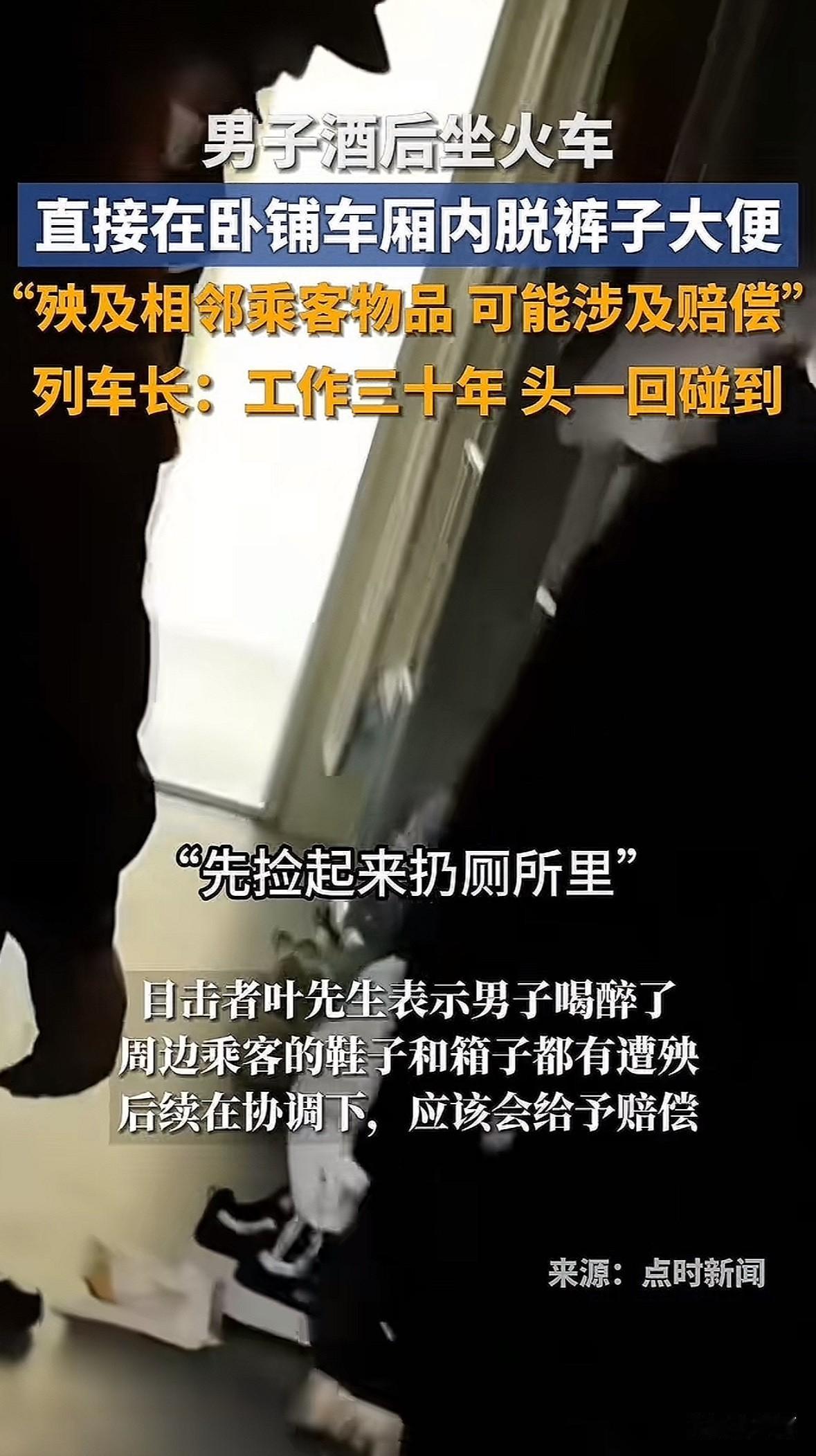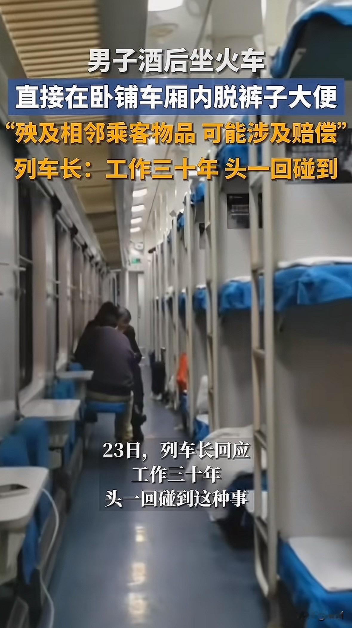 11月22日,洛阳到宁波的K168列车上,一名男乘客喝多了酒,竟在卧铺车厢里脱裤子大便,把周围乘客的鞋子、行李箱都弄脏了。后来经民警协调,他给受影响的人赔了钱,列车长说干了三十年都没见过这种事。 酒喝多不是免责的理由,公共场所得守规矩啊。列车车厢是大家共用的空间,这种行为又脏又影响别人,太没素质了。而且根据《治安管理处罚法》,扰乱公共交通秩序是要受处罚的,赔钱只是一方面,更该记住文明底线。出门在外,多考虑下他人感受,别让酒精冲昏头脑,丢了自己的体面。