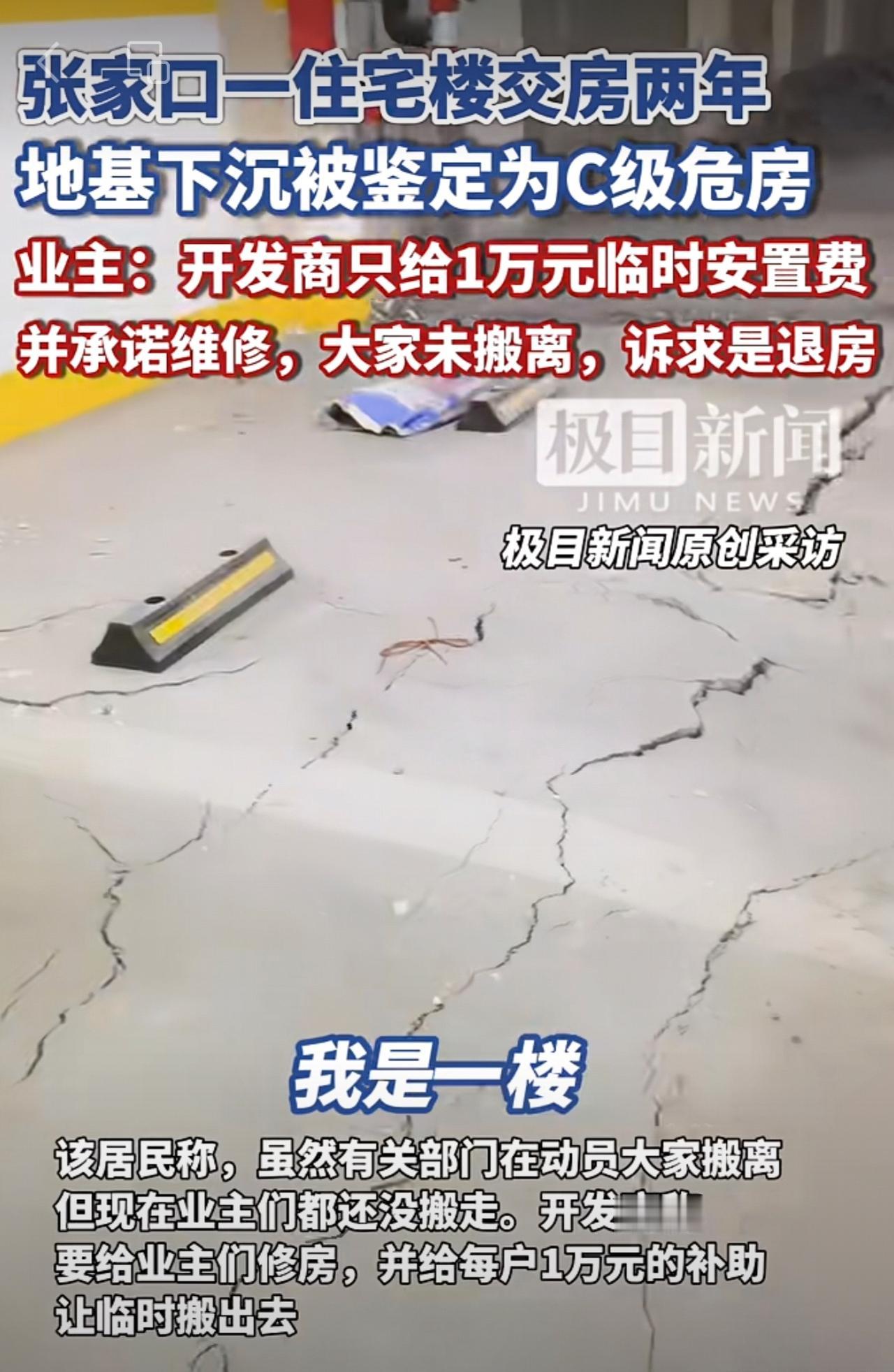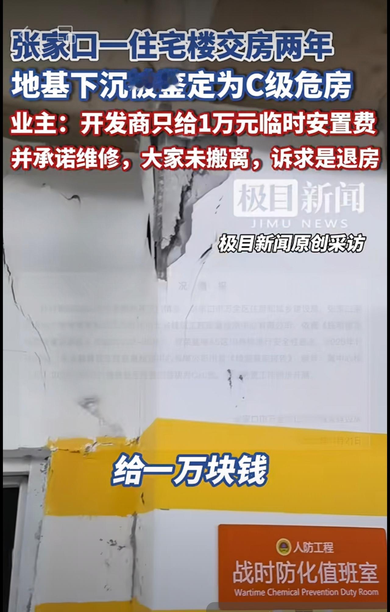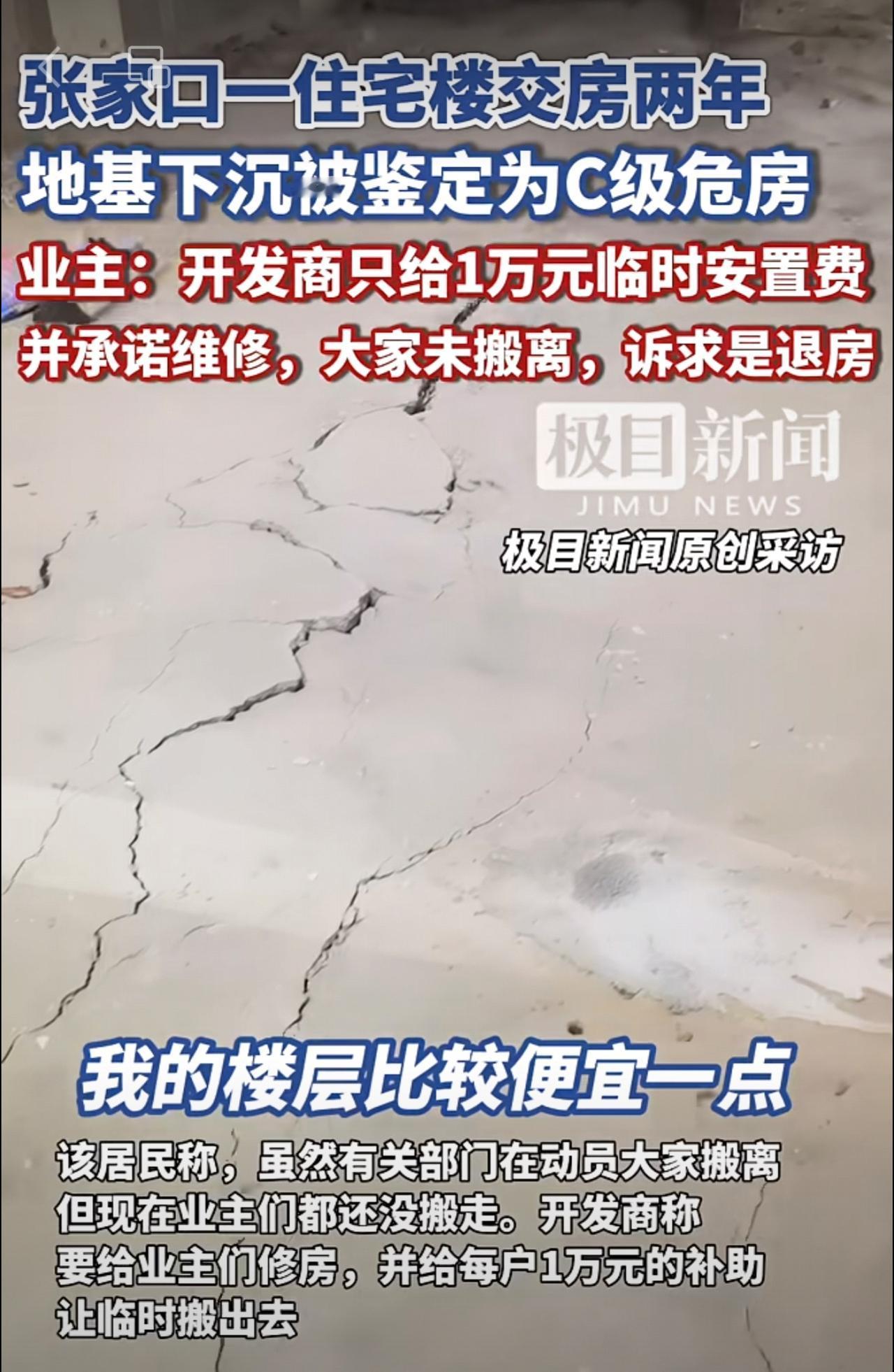 张家口一住宅楼交房两年地基下沉被鉴定为C级危房,业主:开发商只给1万元临时安置费并承诺维修,大家尚未搬离,诉求是退房(原创采访)