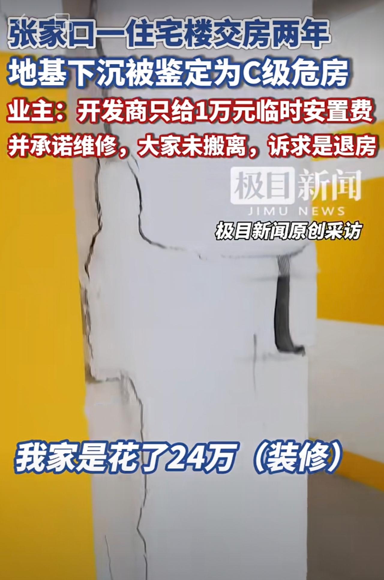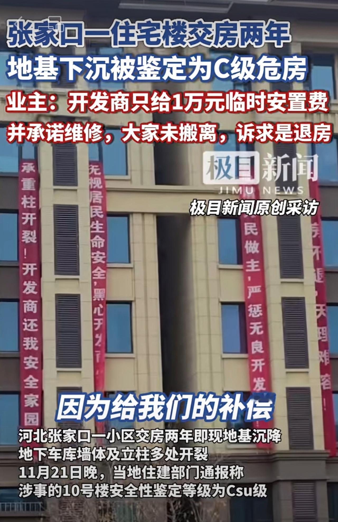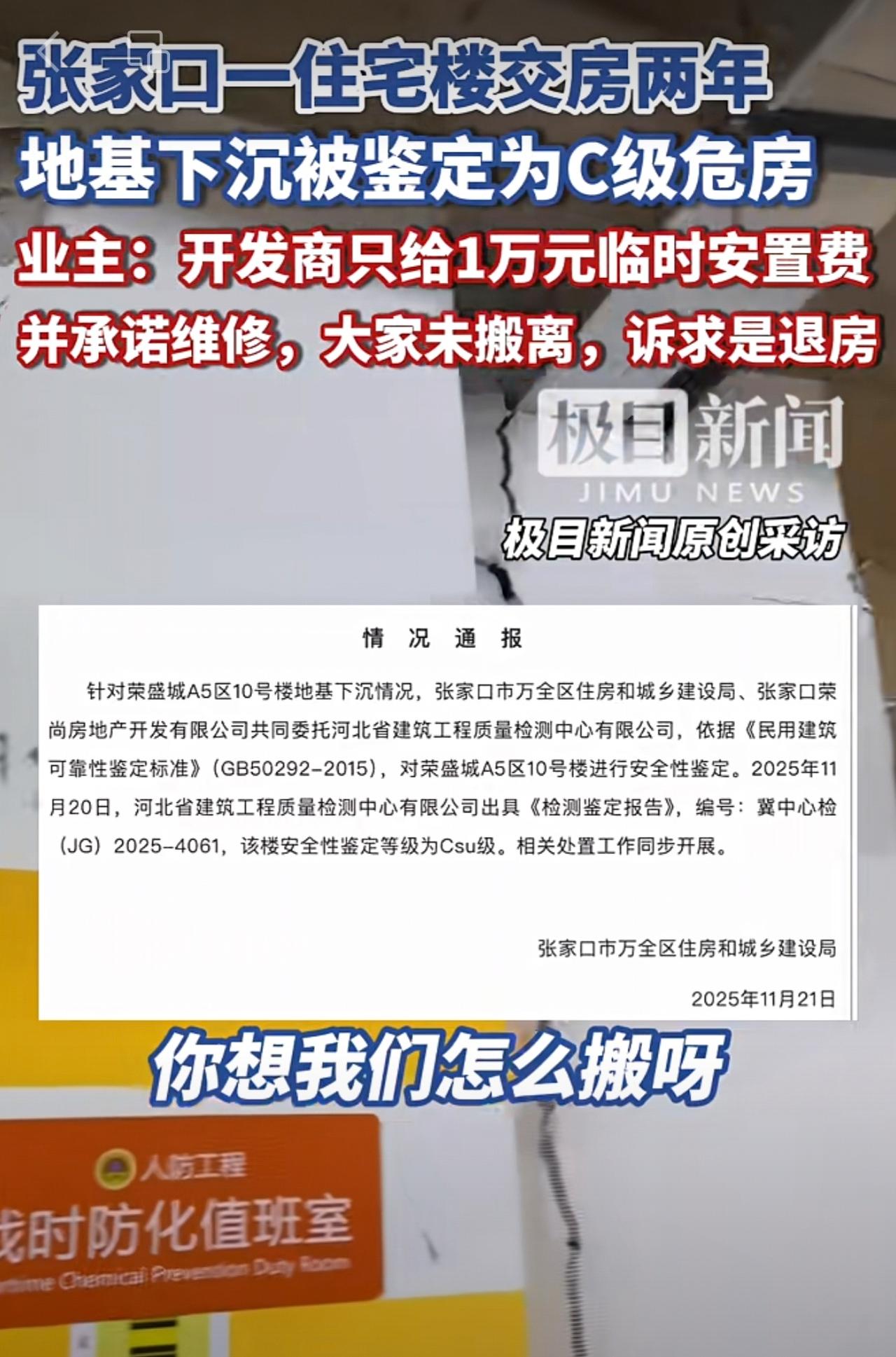 张家口一住宅楼交房两年地基下沉被鉴定为C级危房,业主:开发商只给1万元临时安置费并承诺维修,大家尚未搬离,诉求是退房(原创采访)