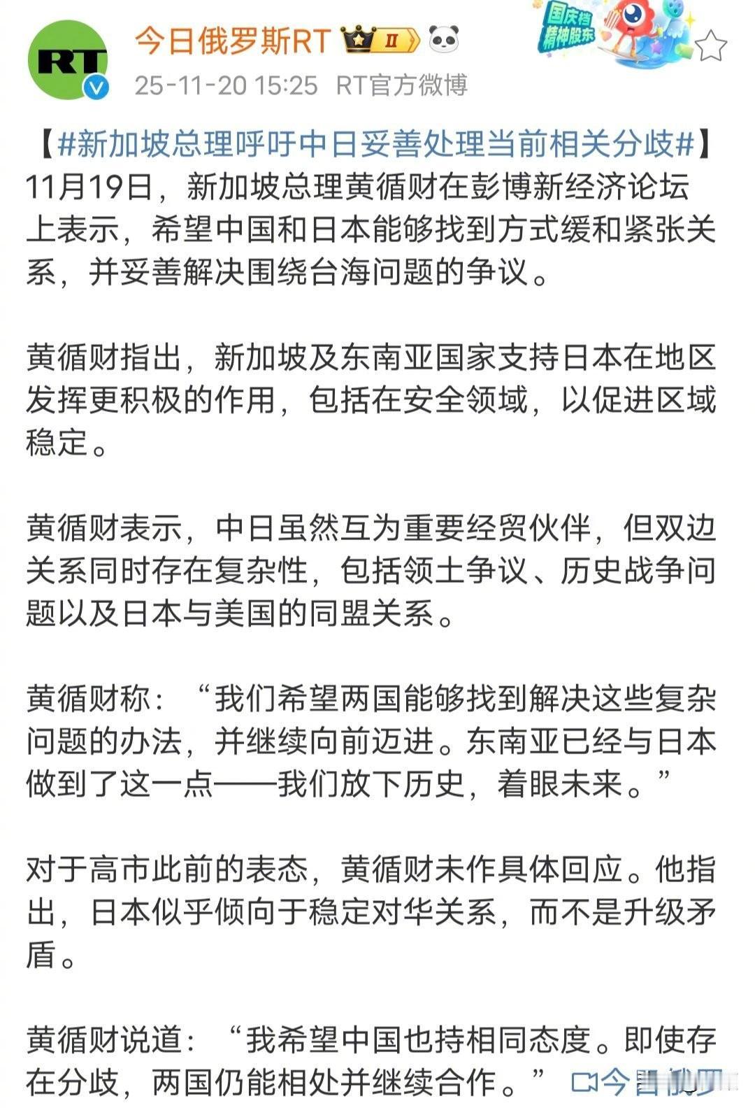 新加坡总理帮高市求情,称日方已停止挑衅,希望中方“放下过去”。 新加坡的态度多少有点拉偏架、和稀泥,就算有人想在中日之间和稀泥也轮不到你新加坡,新加坡的份量太轻了。 大家觉得呢?