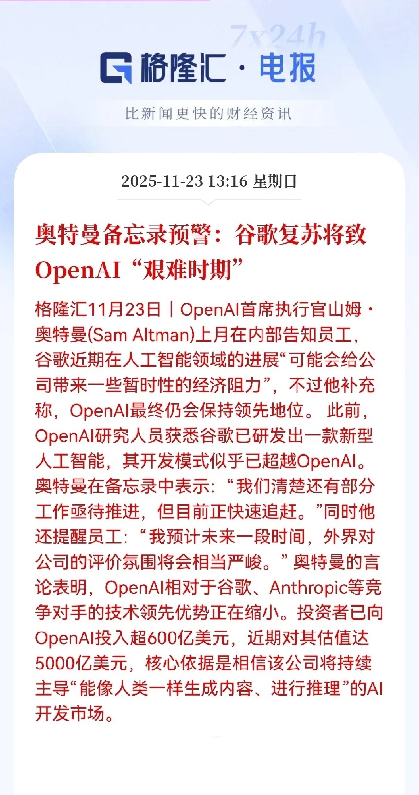 奥特曼这波预警说白了,就是谷歌在AI领域杀回来了,让OpenAI压力山大。谷歌新模型技术进步快,尤其在基础训练上表现抢眼,直接威胁到OpenAI的核心业务!虽然奥特曼强调,追赶和长期信心,但现实很骨感,OpenAI烧钱速度惊人,未来几年得砸千亿搞研发,还面临巨头竞争和资金压力。谷歌财大气粗,背靠搜索和云服务,优势非标明显!OpenAI虽有高估值,但技术领先优势缩小,能否持续领跑得看真本事。这场AI大战进入白热化,OpenAI得边扛压力边突围,前路艰难但也不是没机会!