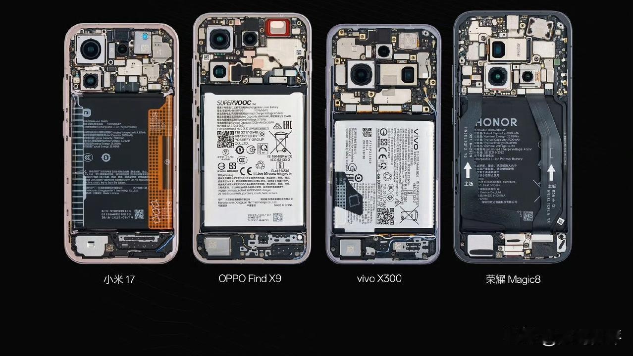 米OV耀标准版旗舰机型拆开,vivo在小尺寸加旗舰影像上只能舍弃大电池了[捂脸]米是选择直立长焦和超小底超广角转头大电池,OPPO和荣耀是机身尺寸更大,所以可以有潜望长焦和大电池[思考]手感就是不如小屏旗舰,目前来看旗舰影像+小尺寸+大电池还是很难三合一的