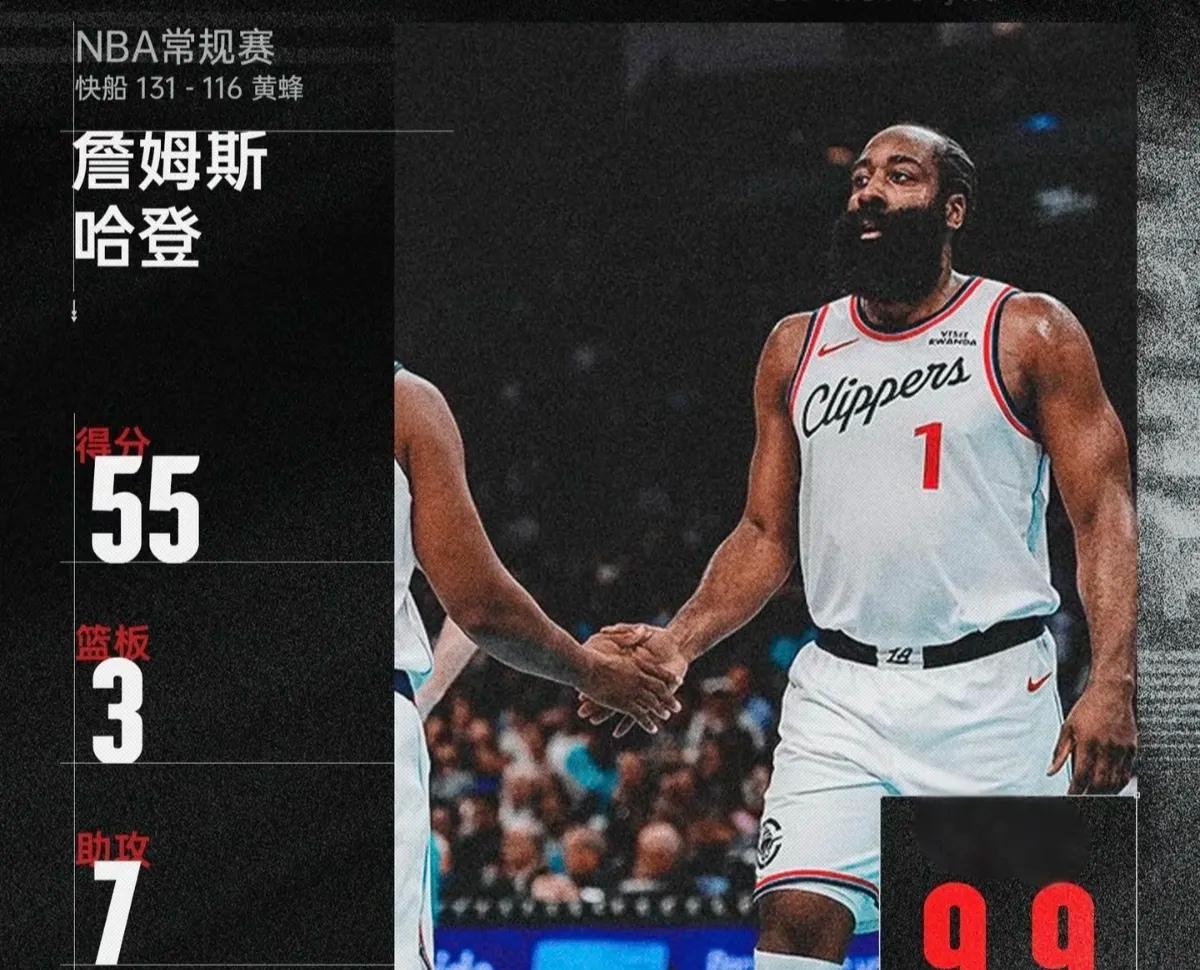 哈登55分刷新快船队史单场最高得分纪录,生涯25次得分50+追平科比并列历史第三