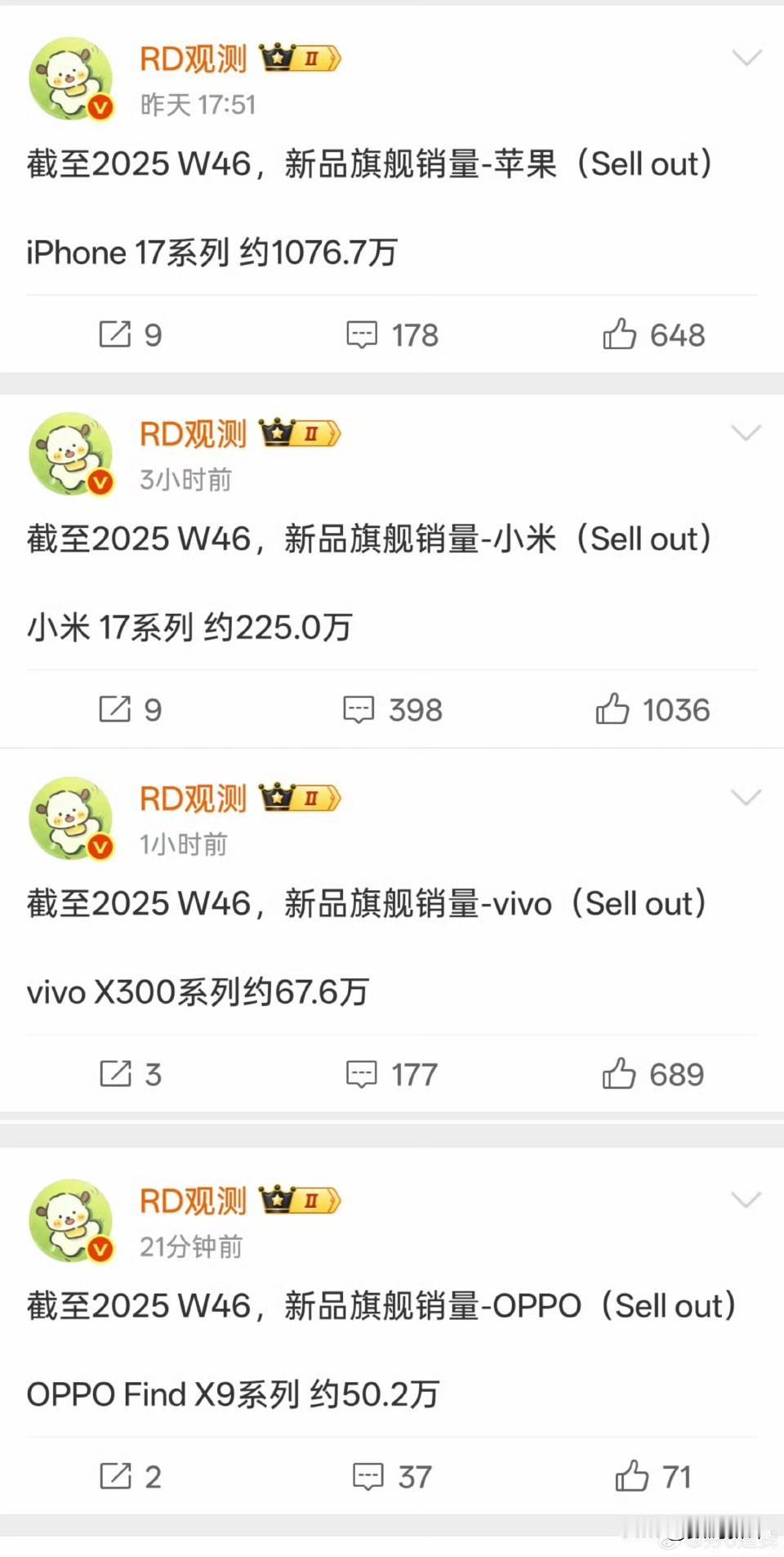 最新旗舰销量对比[灵光一闪]iPhone17系列销量等于小米17系列+vivoX300系列+OPPOfindX9系列之和的三倍!苹果销量确实爆了,小米旗舰机在国产旗舰里也是爆款,OV两家属于正常发挥,Pro占比有进步!所以各家都还不错,有自己的用户群体,问题就是如何进一步扩大[灵光一闪]