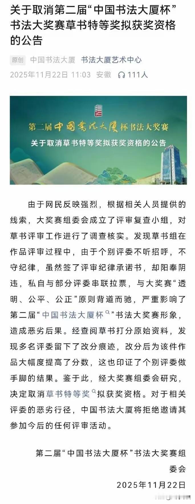真是大开眼界! 这幅草书获得特等大奖! 奖金50万元! 不过 又取消了 怎么回事 本来 书法家张志超的 这幅作品 过关斩将 已拿到特等奖 不料 有人举报 评委有舞弊行为 大奖组委会接到举报 立即展开调查 不查不知道 一查吓一跳 评委串联 竟然改了分数 于是 组委会决定 取消特等奖获奖资格 文海冲浪点评 我左看右看 我上看下看 怎么也看不出 这幅作品 哪里值50万