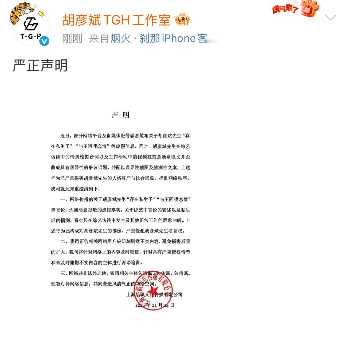 :一、网络传播的关于胡彦斌先生“存在私生子”“与王阿哩恋情”等言论,均属恶意捏造的虚假事实二、我司将针对网络上的内容及时取证,针对具有严重侵权情节和未及时删撤不实内容的主体进行诉讼追责。