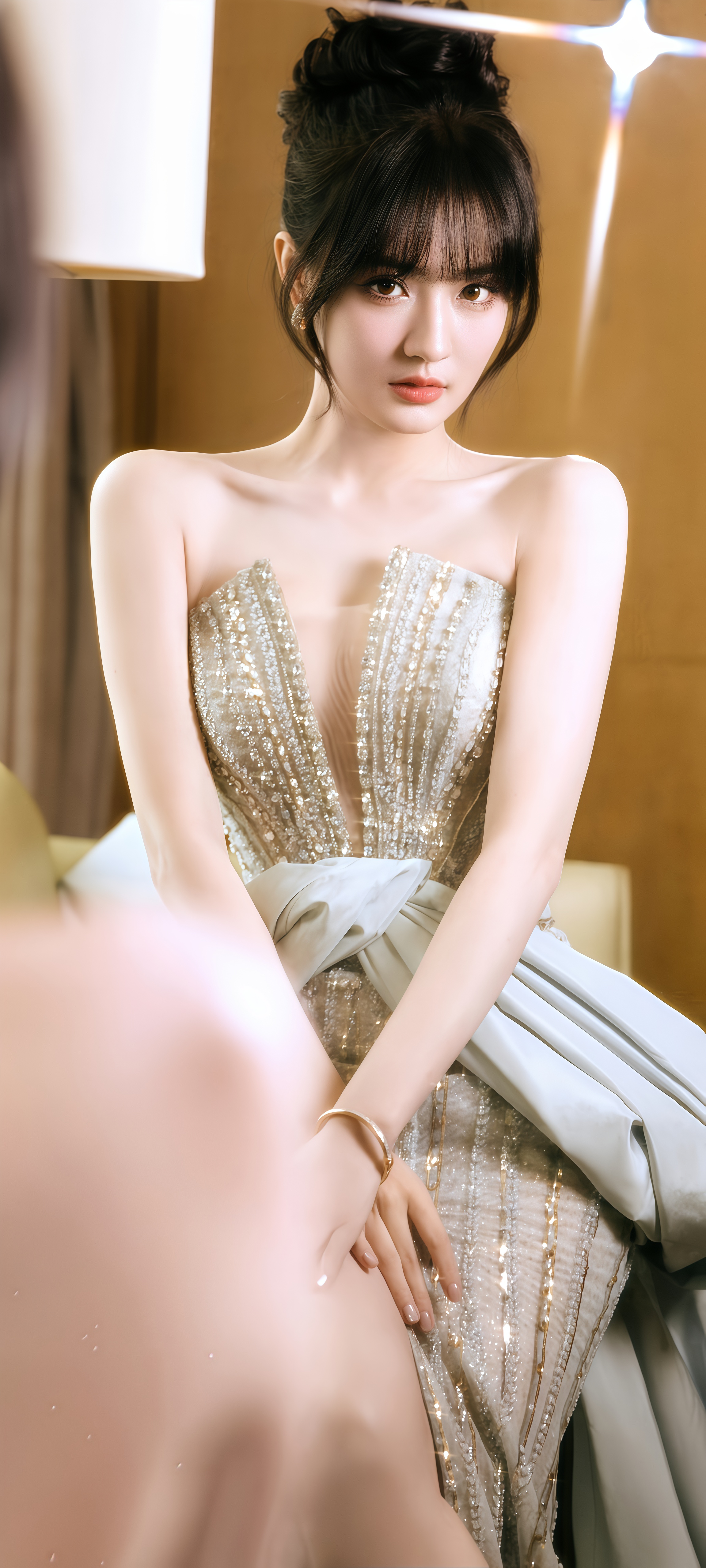 抹胸银白亮片裙裹出蚂蚁腰,胸口V领开到恰到好处,腰侧那圈缎带蝴蝶结像给月光打了个结,走路时亮片晃成细碎星子,高开叉露出的腿又直又白,这比例是女娲捏人时开了会员吧?