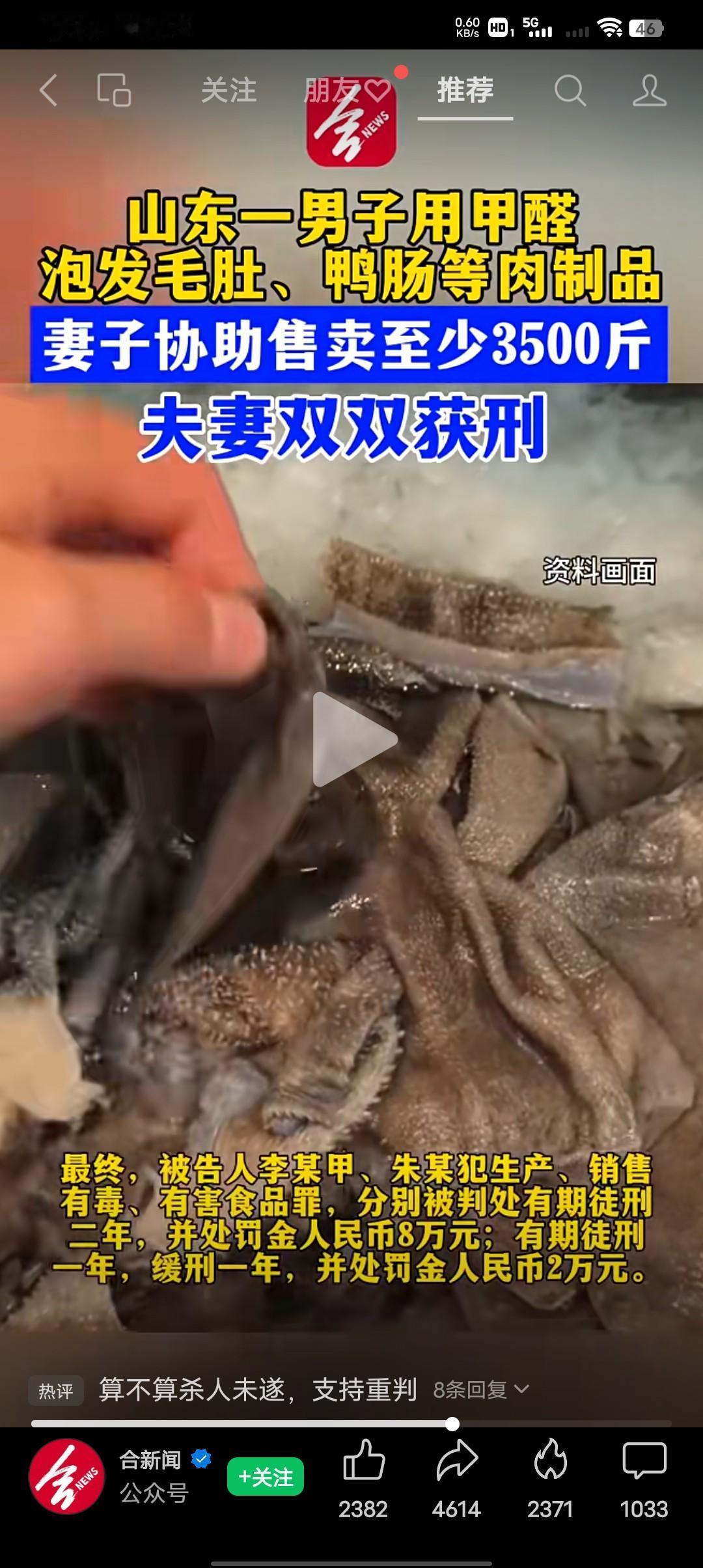 这样算不算杀人未遂? 近日山东东营一男子李某某用甲醛泡发生牛肚、鸭肠等肉制品,妻子明知道丈夫在上述肉制品中使用甲醛泡发,仍协助售卖3500斤左右,夫妻双双获刑。 近日山东省东营市东营区人民法院在中国裁判文书上公布了一则案例。被告人李某某销售生牛百叶,生牛肚,生鸭肠过程中,添加国家明令禁止非食用物质工业用甲醛用以肉类保鲜。 李某某的妻子明知道丈夫在上述肉制品中使用甲醛泡法,依然协助售卖。最终李某某,朱某犯生产销售有毒、有害食品罪,分别被判处有期徒刑二年,并处罚金人民币8万元,朱某有期徒刑一年,缓刑一年,并处罚人民币2万元。 有些人为了自己的利益真的是不顾别人的死活,我就想知道他们自己卖的肉,让他们自己吃行不行?这就是故意杀人,应该重判死刑,才能做到以儆效尤。都说民以食为天,我们的天空都被污染了,我们这些民众该怎么生存?