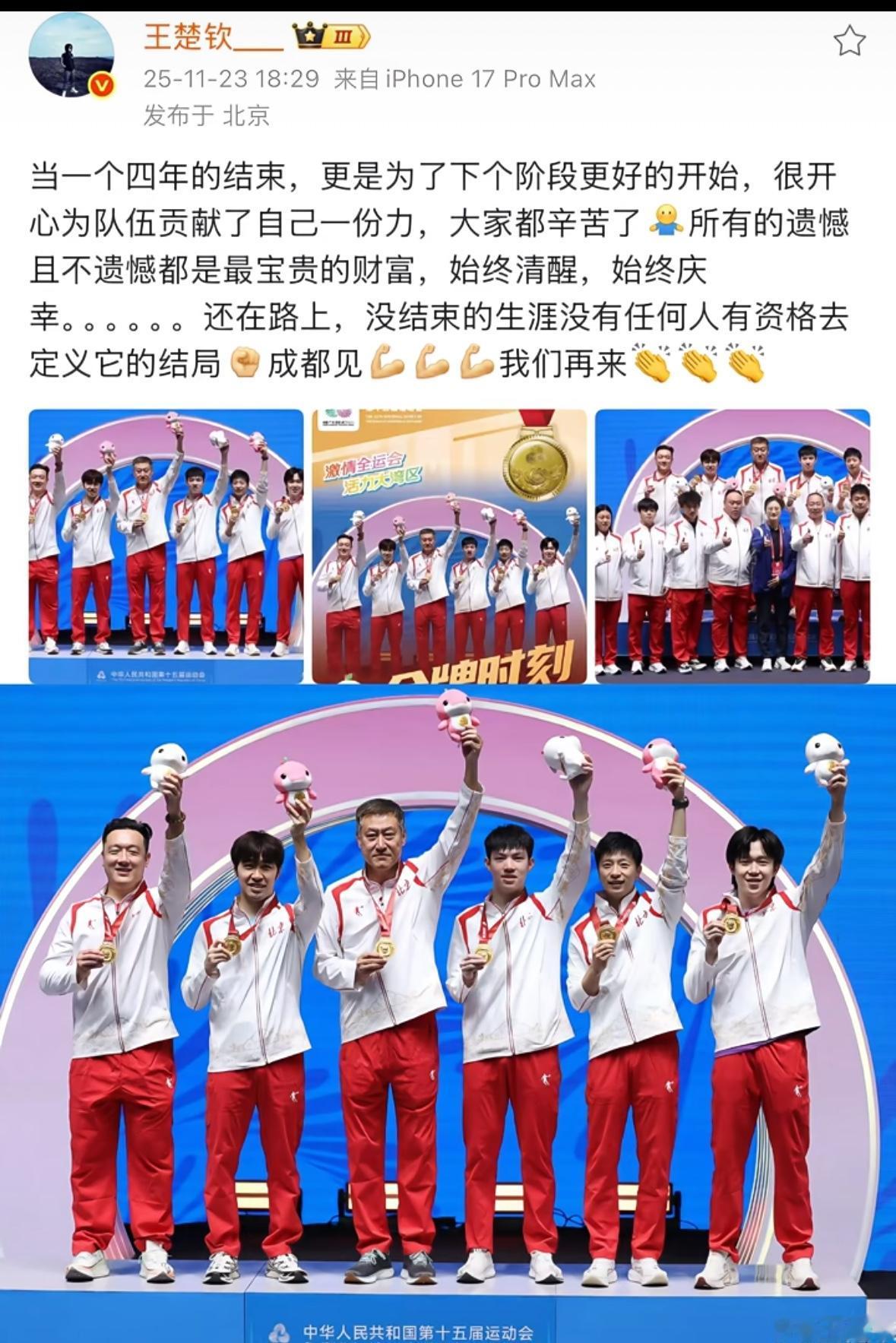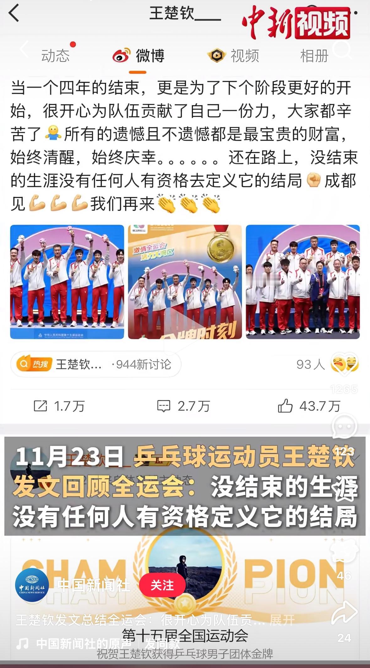 中国新闻社:王楚钦发文总结全运会,很开心为队伍贡献自己的一份力量,没结束的生涯,