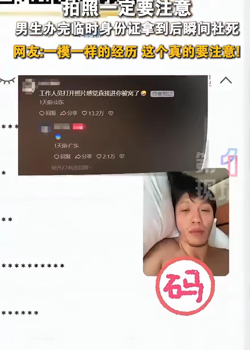 “当场社死了!”广东,一男子出差时发现身份证不见了,就用手机在网上办理临时身份证,可在办理登机时,工作人员看到他的证明时都在笑,开始他还不明白,可看到上面的照片时,才意识到自己当时半裸拍的照片竟然被当成了证件照。 男子出差前翻遍行李,身份证硬是没了踪影。急着赶飞机的他,慌忙用手机申请临时电子身份证,躺在床上迷迷糊糊就按着流程操作起来。 摄像头弹出来时,他只当是普通人脸识别,光着膀子随手一拍,确认提交后便没再管。直到机场柜台递手机时,工作人员的反应让他起了疑心——先是愣神,接着嘴角憋不住地抽动。 他凑过去一看,当场恨不得找个地缝钻进去:那张半裸躺床、头发凌乱的照片,赫然印在电子临时身份证的证件照位置,活脱脱一副“刚睡醒”的模样。 网友的评论更是扎心又好笑。有人说:“只要你不尴尬,尴尬的就是工作人员”;还有女网友吐槽:“我也干过这事,半裸拍的,现在想起来还头皮发麻”。 其实尴尬这东西,从来不是单人行。你今天笑别人的糗事,明天可能就轮到自己上演“人生名场面”,不过是大家都藏着不说罢了。 笑归笑,这事儿更该当提醒。如今手机办事越来越便捷,可我们总凭着惯性“随便点点”。以为是人脸识别的步骤,可能正在存档正式照片;以为没人在意的随手一拍,下一秒就会被外人看到。 那些被我们忽略的细节,往往藏着让人措手不及的尴尬。往后办事多上点心,别让一时的马虎,成了别人茶余饭后的谈资。