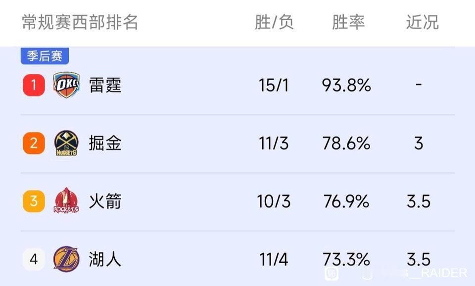 NBA西部目前的第一梯队,雷霆、掘金、火箭、湖人这四支球队,赛季初马刺也能算,不