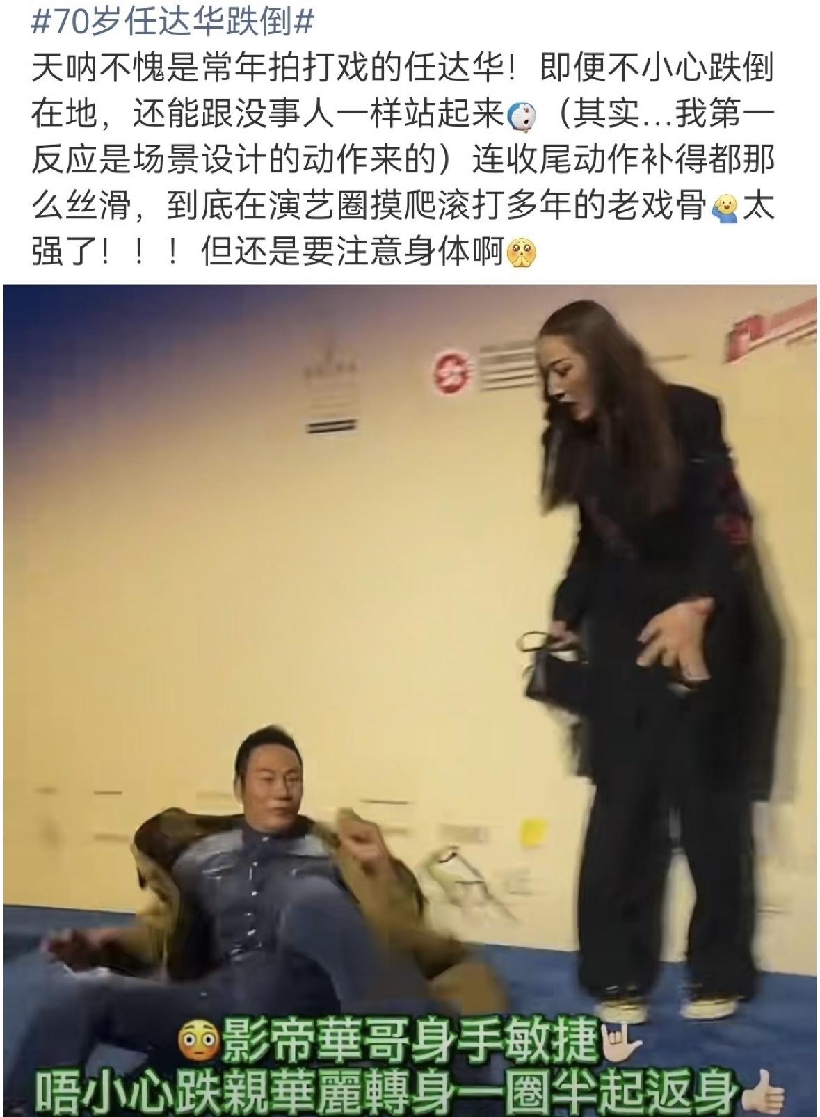 这个世界上我最想不通的人,就是任达华了。明明都70岁了,摔倒后8秒丝滑起身,身手比年轻人还矫健敏捷。 2025年11月22日的香港时装活动现场,这场“教科书级自救”让全网惊呼。当时舞台地毯未固定翘边,任达华被绊倒瞬间,眼镜直接甩飞3米外,整个人向前扑去。 危急时刻,他没有硬扛冲击,而是本能地顺势翻滚半圈,将垂直坠力转化为水平位移,接着单手撑地、膝盖借力,一气呵成站定,全程仅用8秒。 起身后他立刻比出剪刀手,用粤语笑着调侃:“没事没事,好犀利!对蓝色地毯有情怀。” 轻松化解尴尬,现场紧张的气氛瞬间被笑声取代。 这波操作绝非偶然,背后是他刻入骨髓的健身习惯。多年来他坚持每日清晨5公里慢跑,搭配太极卸力训练,手腕旋转32度的缓冲动作,正是太极技巧的实战应用。 为了维持身体状态,他每半年必做一次骨密度筛查,常年佩戴护腰强化核心稳定性,小重量高次数的力量训练让体脂率稳定在18%,远超同龄男性平均水平。 更关键的是45年演艺生涯积累的肌肉记忆。2025年7月上映的《缉盗》中,他全程无替身完成所有动作戏,挥刀、转身都拳拳到肉,这种训练让“受身”技巧成为本能。 早年拍《PTU》时,他就曾反复练习摔倒缓冲动作,没想到多年后在现实中派上用场。用他的话说:“拍戏的功夫,从来不是白练的。” 现场最让人动容的还有妻子琦琦的反应。看到丈夫摔倒,她第一时间失声惊呼“老公你怎么了”,语气里满是牵挂,事后立刻蹲下身用酒精棉签检查他的手肘和膝盖。 这对结婚27年的夫妻,早已把健身变成默契。琦琦坚持普拉提维持核心力量,两人经常一起运动,这份陪伴也让任达华的健身之路从未间断。 对比同龄艺人,任达华的状态更显难得。同样70岁的周润发,2025年参加马拉松时就曾因路滑摔倒,导致肋骨骨裂,而任达华靠系统训练成功规避了风险。 医生事后解释,70岁男性股骨颈骨折率是40岁的六倍,任达华能安然无恙,除了自救动作标准,更离不开常年的骨密度维护和核心力量训练。 网友们在评论区炸开了锅:“华哥这哪是摔倒,分明是行为艺术!”“我30岁爬楼梯都喘,他70岁翻滚起身不费劲”“建议把这个自救视频纳入老年防护教材”。 还有人翻出他2025年6月在山东收麦子的照片,田间劳作的身影充满活力,7月又顶着烈日拍玉米地写真,这份接地气的状态让网友直呼“不像影帝像邻家大叔”。 事件发生后,任达华工作室仅用2小时就发布声明,确认他仅轻微擦伤,已安全返家,同时强调11月25日的杭州活动会如期举行,不让粉丝失望。 主办方也第一时间道歉,承诺全面检查舞台地毯,优化高龄参与者的安全防护措施,避免类似意外发生。 更暖心的是,任达华团队借着这波热度,整理发布了居家防摔教程,从鞋底摩擦测试到扶手高度建议,把个人意外变成了公益科普。 在我看来,任达华的“不老身手”从来没有秘诀。是每日不辍的健身坚持,是数十年演艺生涯积累的专业素养,更是对生活始终热忱的态度。 他11岁丧父,早早扛起家庭重担,从龙套演员到金像奖影帝,吃过的苦都化作了坚韧的底色。如今70岁仍活跃在片场,用作品证明“年龄只是数字”。 未来随着杭州活动的举行,相信他还会带来更多惊喜。而这场意外也给所有人提了个醒:健康从不是天生的,而是靠日复一日的自律浇灌出来的。 任达华用实际行动告诉我们,衰老并不可怕,可怕的是放弃对自己的要求。愿我们都能像他一样,在岁月里保持活力,在生活中守住健康。 文章描述过程、图片都来源于网络,涉及版权或者人物侵权问题,或有事件存疑部分,联系后即刻删除或作出更改