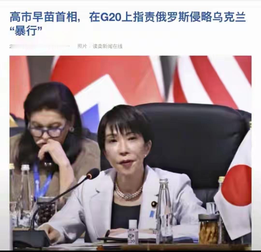 日本首相高市早苗前脚抛出涉台不当言论,后脚高市早苗在G20峰会上公开指责俄罗斯对乌克兰的侵略是动摇国际秩序根基的暴行。 不得不说,高市早苗作为右翼分子,就是勇敢好战,否认南京大屠杀,参拜靖国神社,颠倒黑白,还死不悔改,自己都没整明白,竟然反过来公开指责起来俄罗斯了,真是有点倒反天罡,多少有点只许州官放火,不许百姓点灯的味道,关键俄罗斯也不是软柿子。日本要是真心实意的要援助乌克兰,就把进口俄罗斯天然气停了,净干些吃饭砸锅的事,说一套做一套。