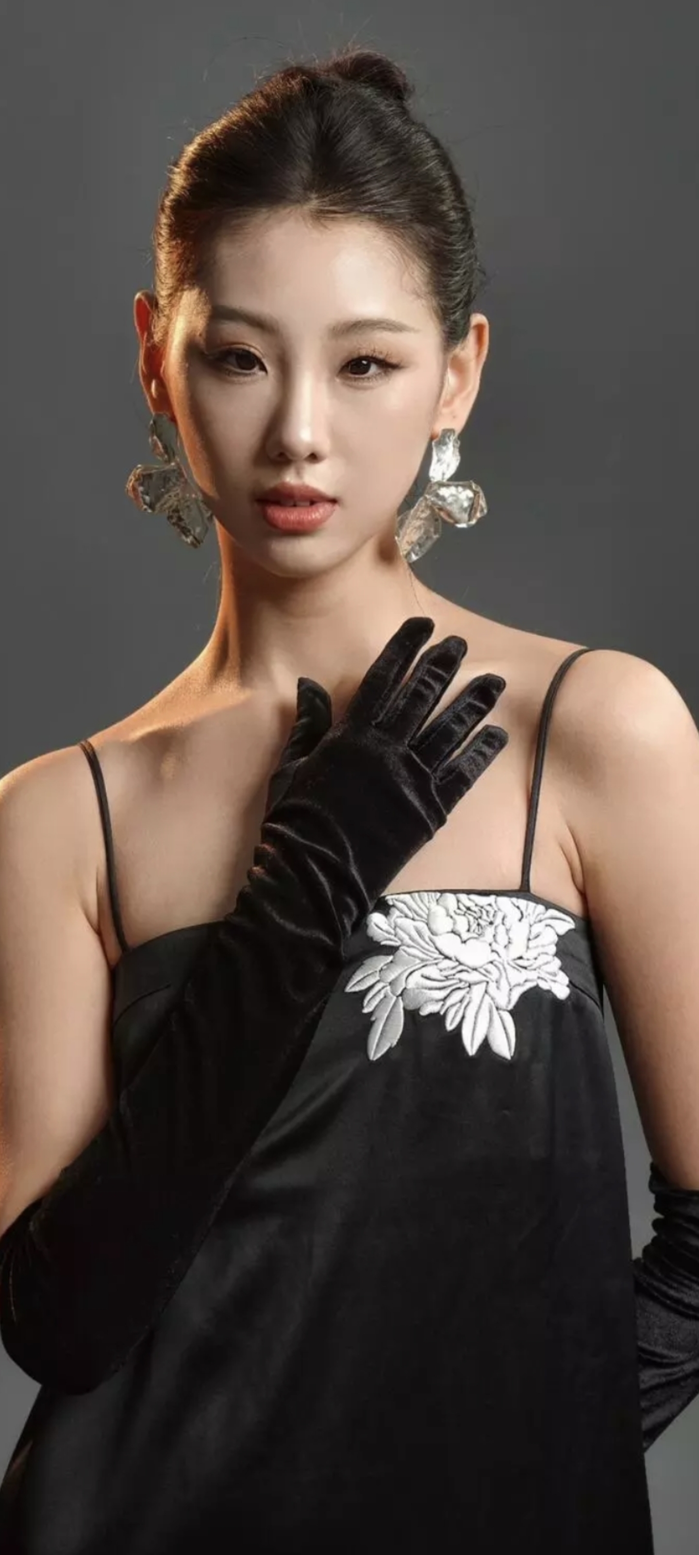她身着绣金繁花的绸缎裙,轻纱袖摆漾着温柔,同色系高跟鞋衬得雅致。在轻奢空间里,将