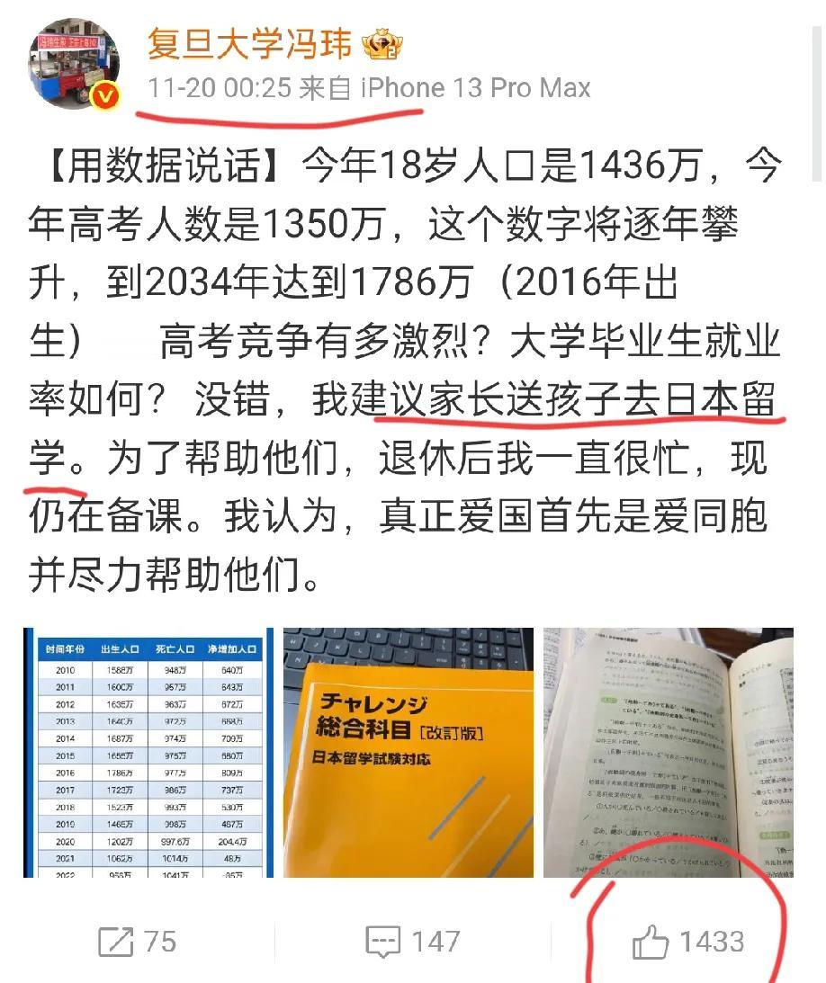 这个时候动员家长把孩子送去日本,这是什么动机?公开跟国家对着干? 外交部警示留学日本以及前往日本旅游的高风险,某大学教授冯桑逆流对抗国家意志,鼓励资助日本,然后给日本送人质? 关键评论底下,还有好多人支持。我也是醉了,这环境,这钱真得这个时候赚吗?