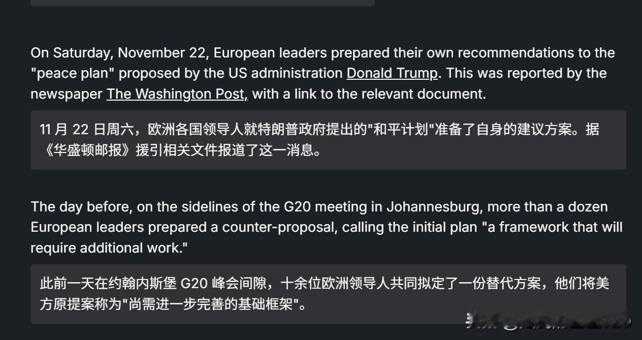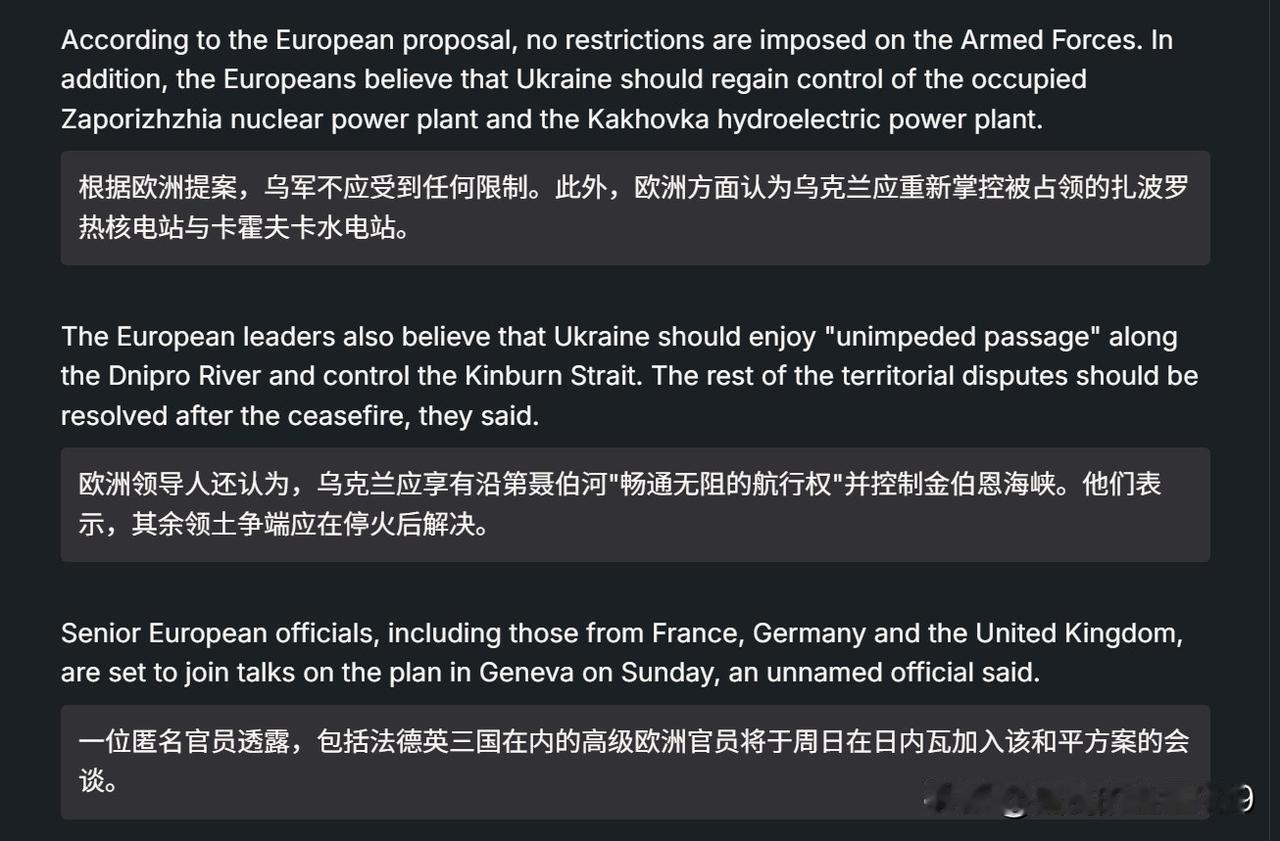 据《华盛顿邮报》报道:欧洲代表团就美国乌克兰和平计划提出反建议。 据报道,欧洲方面的文件概述了三个关键点: 1.不会对乌克兰武装部队施加任何限制。 2.乌克兰将重新获得对扎波罗热核电站、卡霍夫卡大坝、第聂伯河沿岸"畅通无阻的过境点"以及金本沙嘴的控制权。 3.其他领土问题将在停火后解决,乌克兰军队将继续驻扎顿巴斯地区而非撤离,以此作为停火的交换条件。 这些欧洲人吧,怎么说呢……就也挺欢乐的。