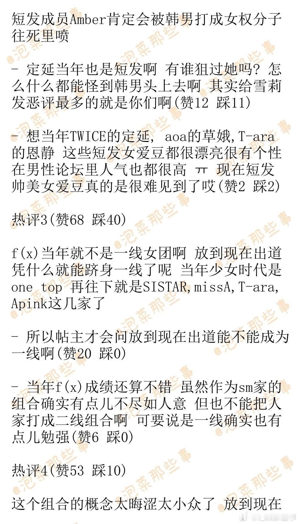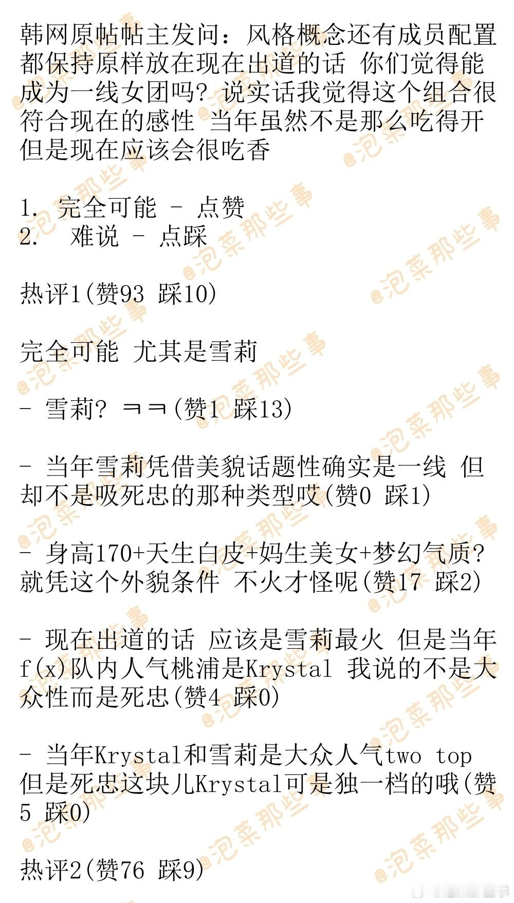 🔥韩网热帖评论翻译🔥f(x)放到现在出道的话能成为一线女团吗?韩网原帖帖主发问:风格概念还有成员配置都保持原样放到现在出道的话 你们觉得能成为一线女团吗? 说实话我觉得这个组合很符合现在的感性 当年虽然不是那么吃得开 但是现在应该会很吃香 1. 完全可能 - 点赞2. 难说 - 点踩cr.pann