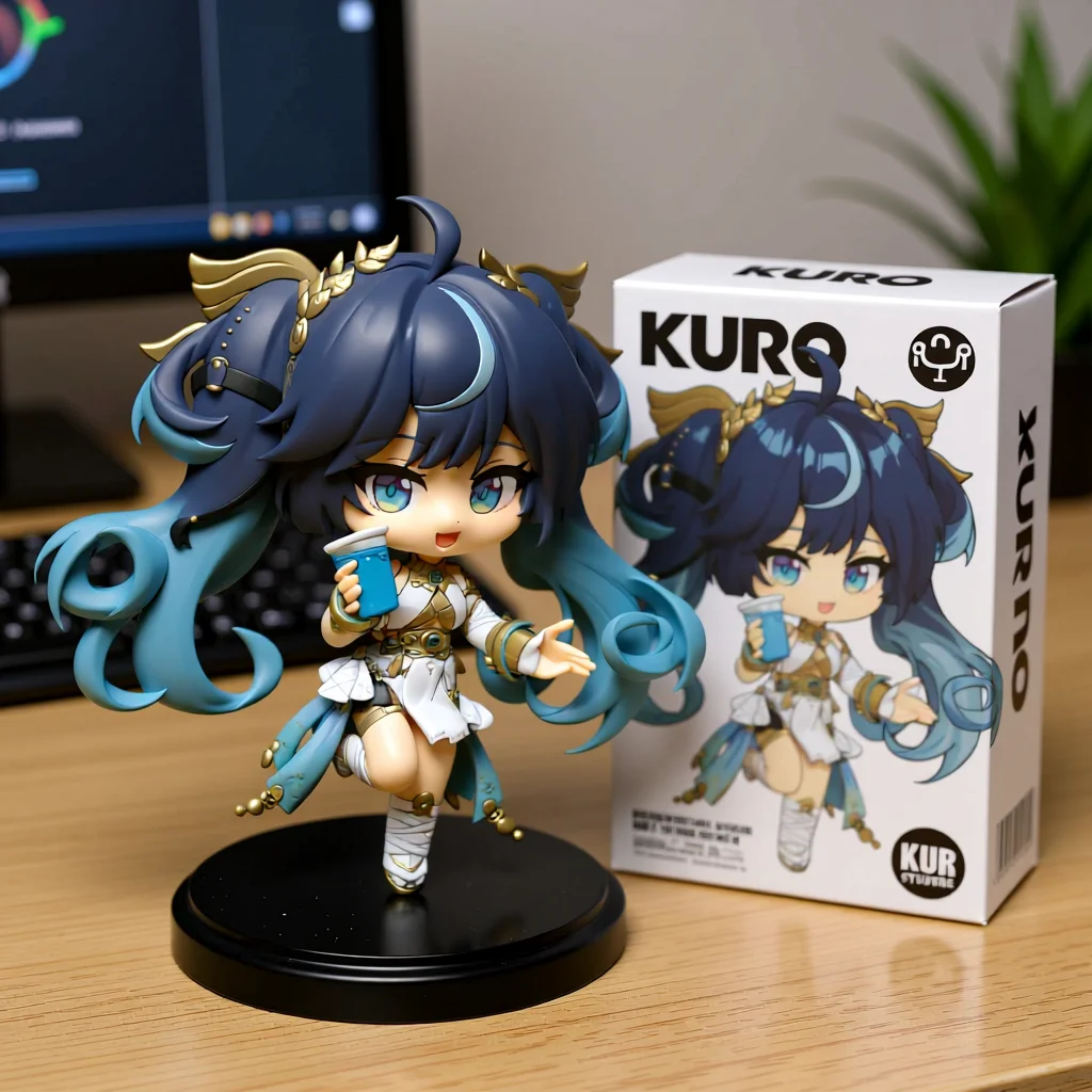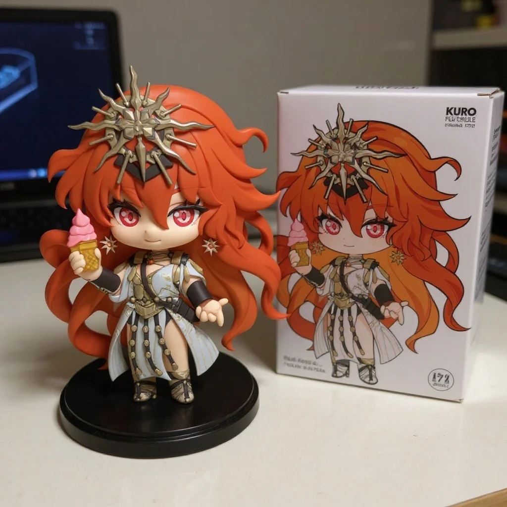 Draw a prospective model of the character in the picture, commercialized as a 1/7 scale full body figure. Please make this image into a real-life figure photo. Place the figurine version of the photo I provided on a round black plastic pedestal.I would like the PVC material to be clearly visible. The background should be a computer desk.