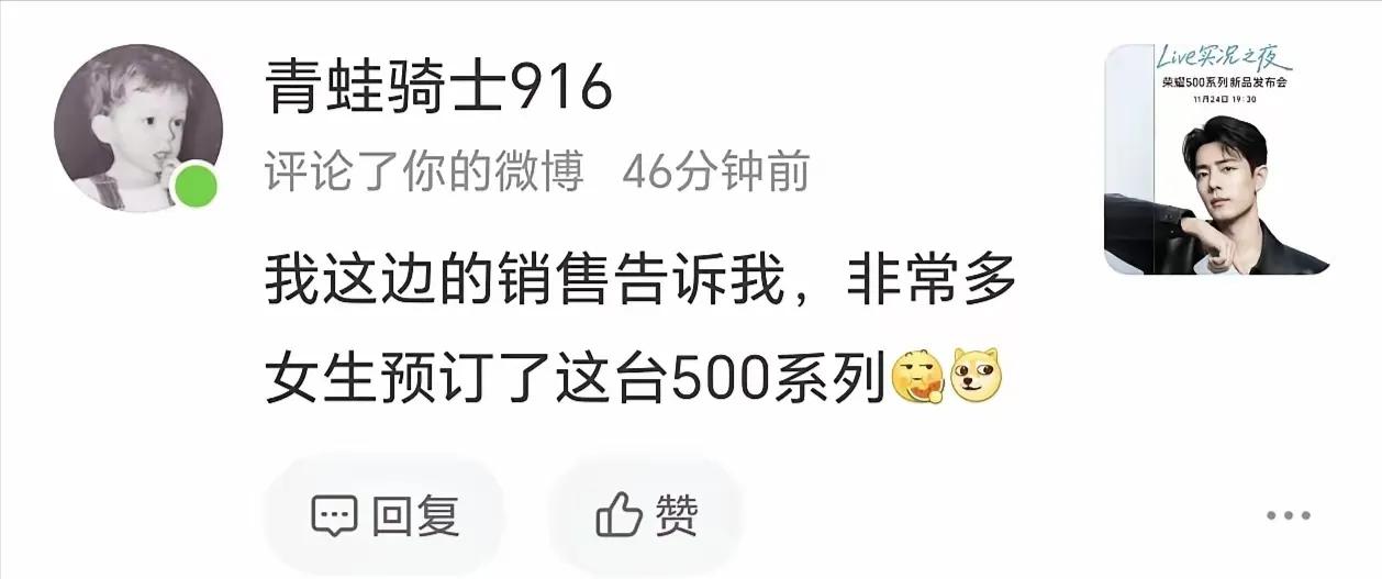 荣耀500系列万事俱备,只欠东风。硬件堆料诚意在线,工业设计同样出色。 收集网络风评9.8分,荣耀MagicOS系统口碑一直稳;代言人肖战作为流量大户,其影响力相当靠谱”或者“代言人肖战本身流量巨大,且形象与产品契合度很高,相当靠谱。 只要定价延续在"荣耀400",这一代荣耀500必成爆品。微博粉丝留言:线下门店很多女生直接预订。