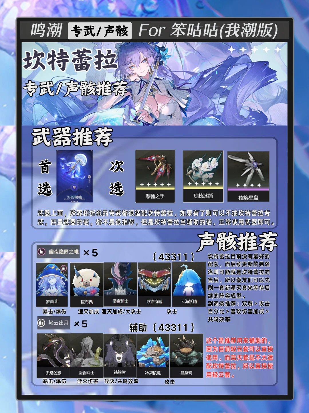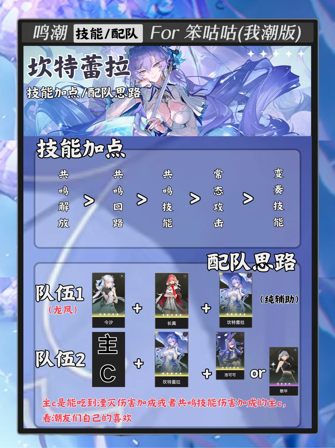 鸣潮 鸣潮创作激励 踏上鸣日的征程 鸣潮攻略 全能暗队奶C 鸣潮黎那汐塔 鸣潮坎特蕾拉 去优雅地掌控,去仔细地品尝吧,你即将面对的一切……[得意R] 本期内容带来的是2.2版本新角色“坎特蕾拉”的培养攻略~ 内含专武/声骸/配队等内容~ 观看的小伙伴觉得不错的话一点要给个大大的赞噢!(内容制作数据相关参考鸣潮wiki,有错误引导,欢迎大家指教批评,笨某一定虚心接受!!) ------グッ!(๑•̀ㅂ•́)و✧------- 觉得有用的话一定要关关笨咕咕哦!好了,以上就是本期的全部内容。 ⭐制作不易,严禁任何商业性转载及搬运,转载需标注出处~ ⭐制作难免会有错漏,希望大家多多指出,我会及时修正喵~ ⭐祝大家都能十连双金!