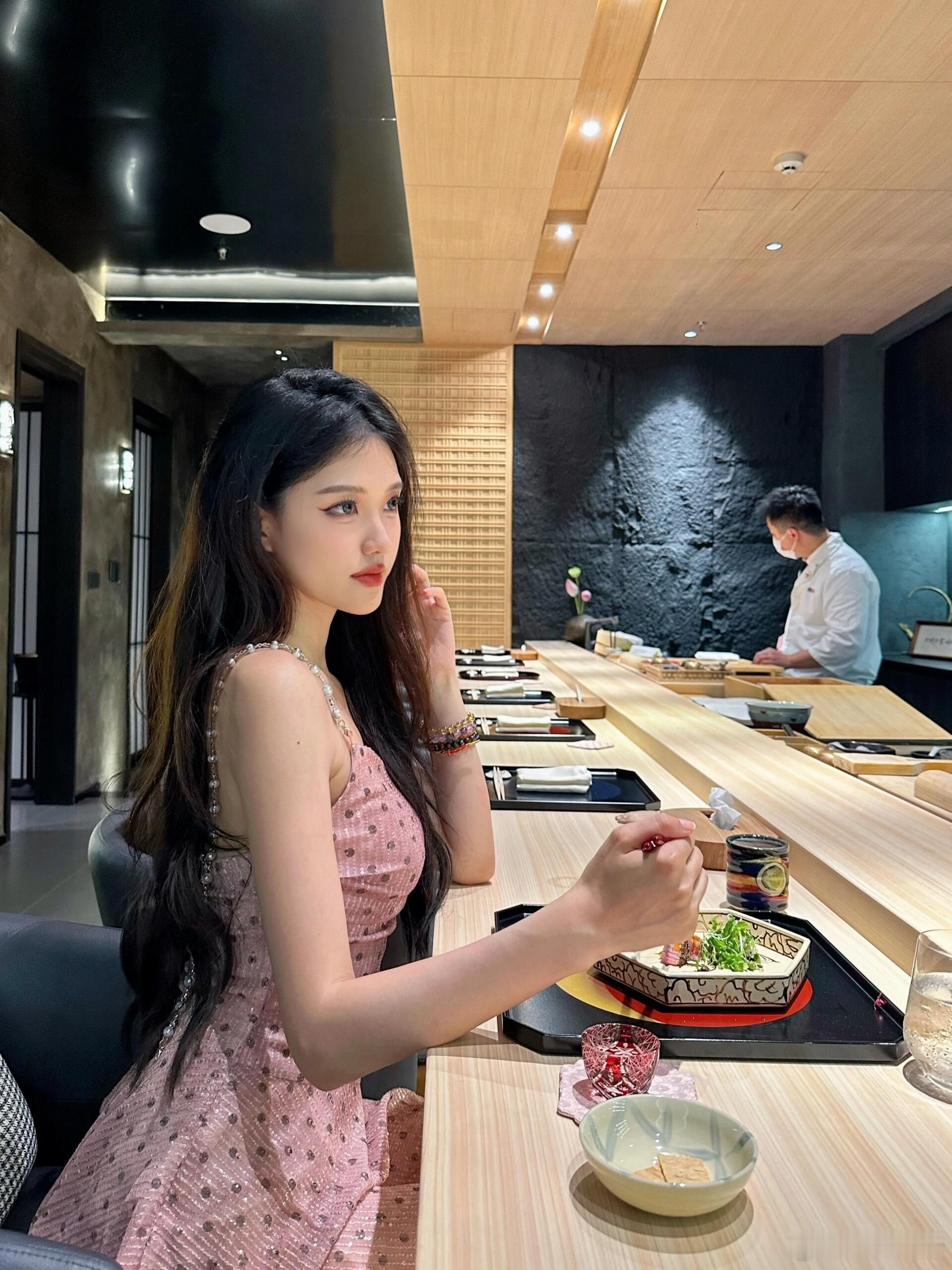 韩国美女拿着白手套,在介绍韩国的辣白菜,面前就配了一碗白米饭,还有一碗白菜