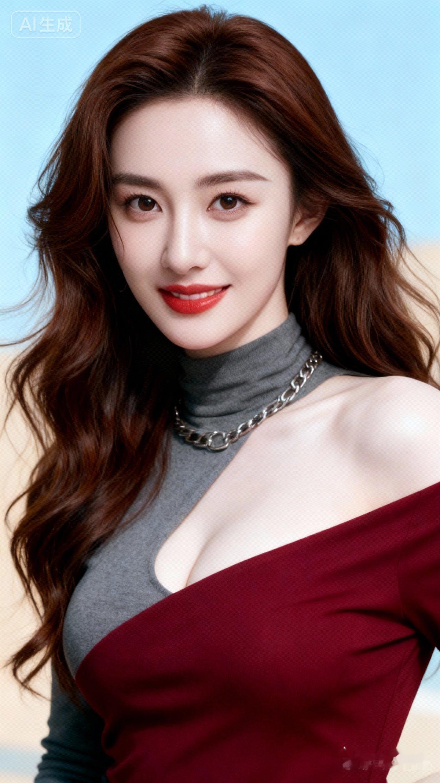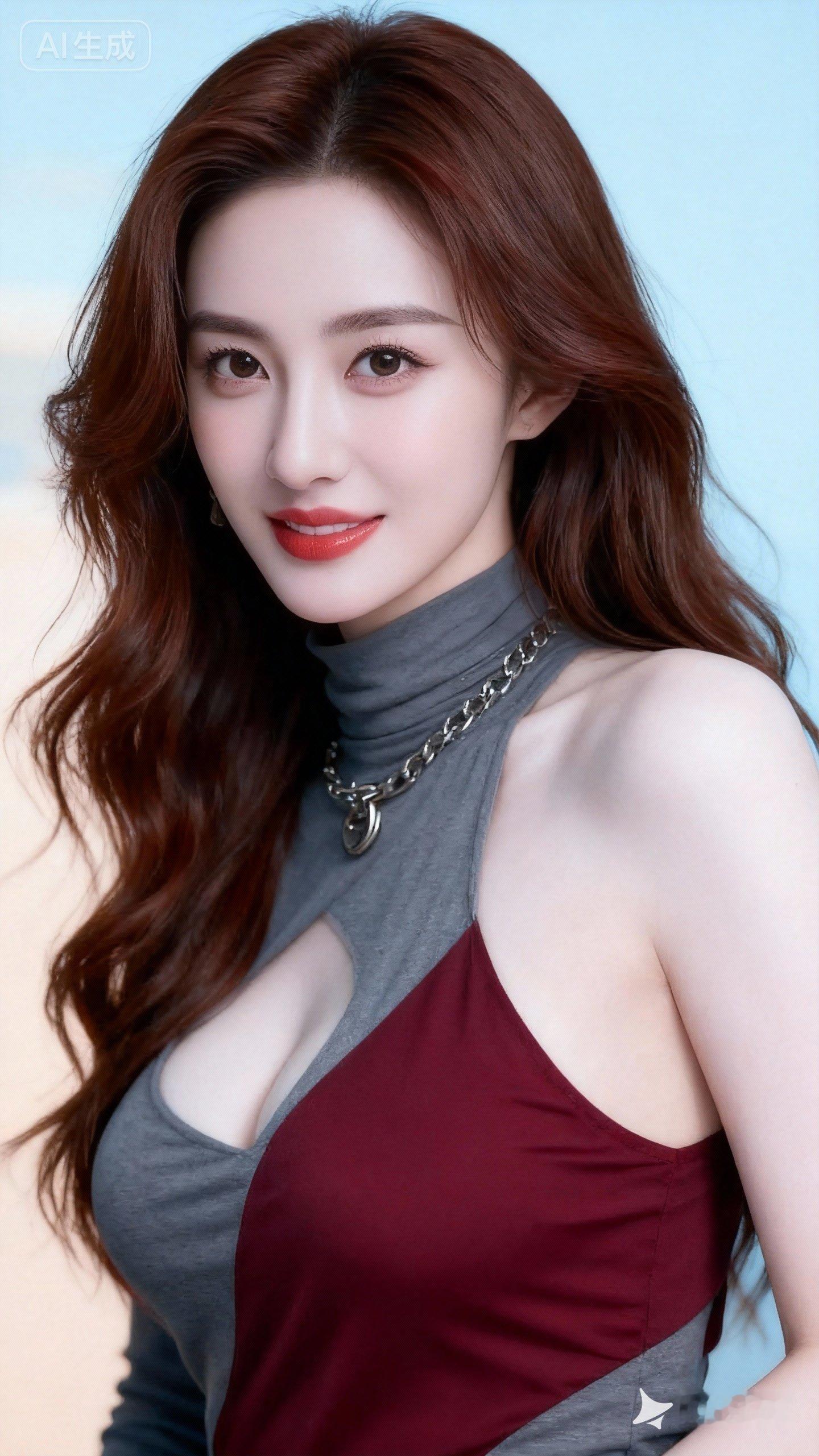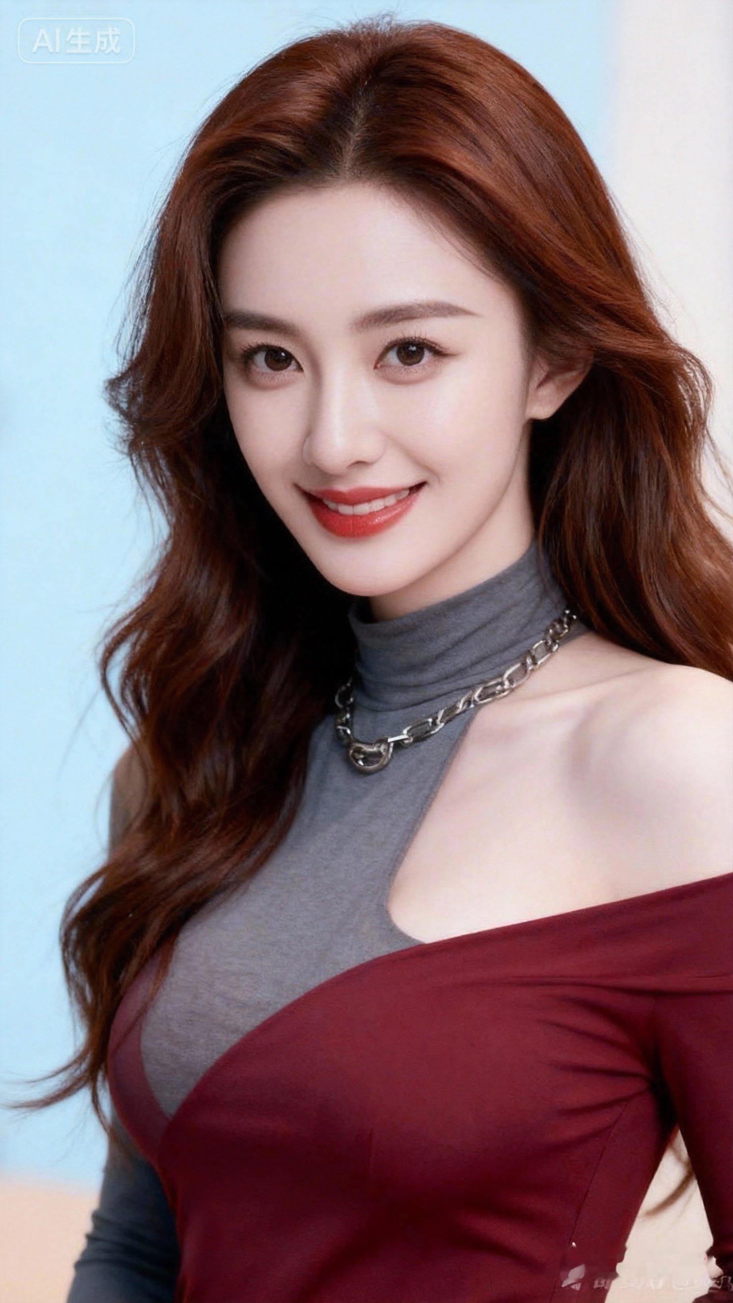 微距拍摄的中国现代美女高清头像,栗棕色长微卷发蓬松灵动,冷白皮肌肤红润透亮,面部轮廓分明。高级露单肩高领上衣(烟灰色加深红色)简约时尚,搭配金属锁骨链,胸部丰满有型美图分享