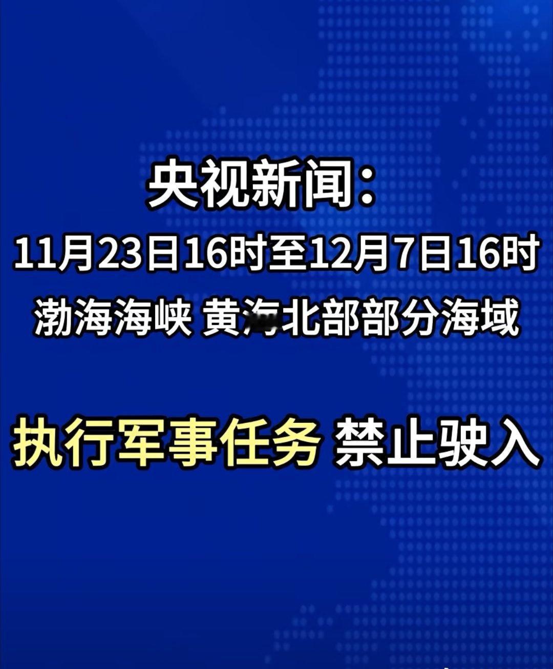 央视新闻: 11月23日16时至12月7日16时渤海海峡 黄海北部部分海域执行军事任务禁止驶入。 划重点执行军事任务,让我们拭目以待吧
