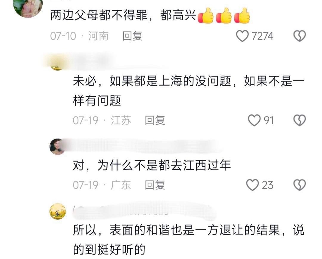 罗晋其实在这段婚姻里,牺牲也挺大的,他是独生子,结婚这么多年,唐嫣却从来没跟他一起,回江西老家过年。而是每年罗晋的父母跟着儿子,一起到上海,跟唐嫣还有她爸妈一家过春节。正如评论区网友所说,看似幸福和谐的处理方式,不过是一方的退让和妥协罢了。高圆圆每年过年,还跟着赵又廷回台北过年呢,刘诗诗前几年也是回吴奇隆老家过年。唐嫣却从来没回过罗晋老家。她看似温柔体贴,实则挺傲娇的。