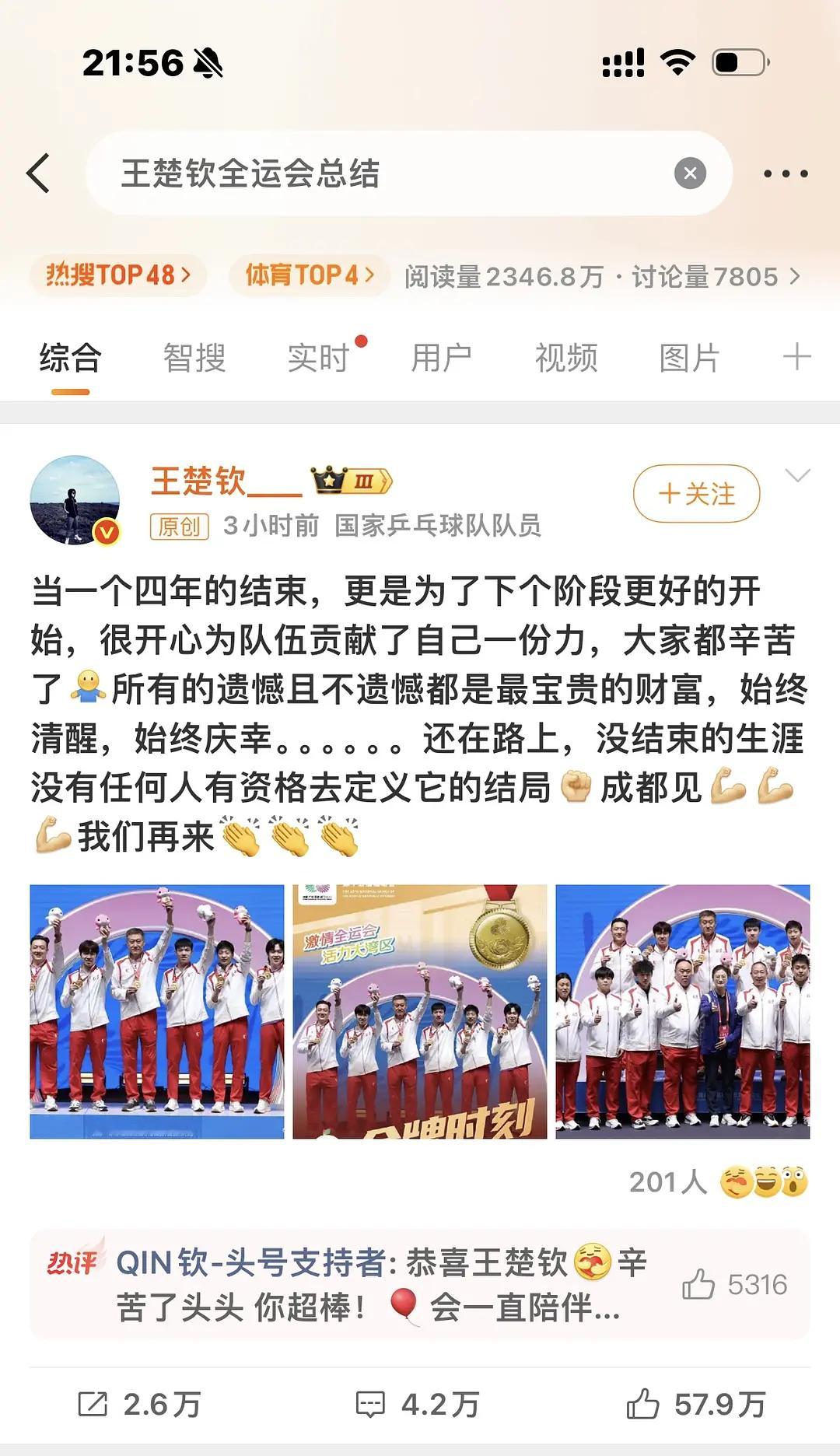 关指的衣服上有王楚钦的签名,楚钦一直是他的最爱,他称楚钦叫“孩子”。全运会结束了