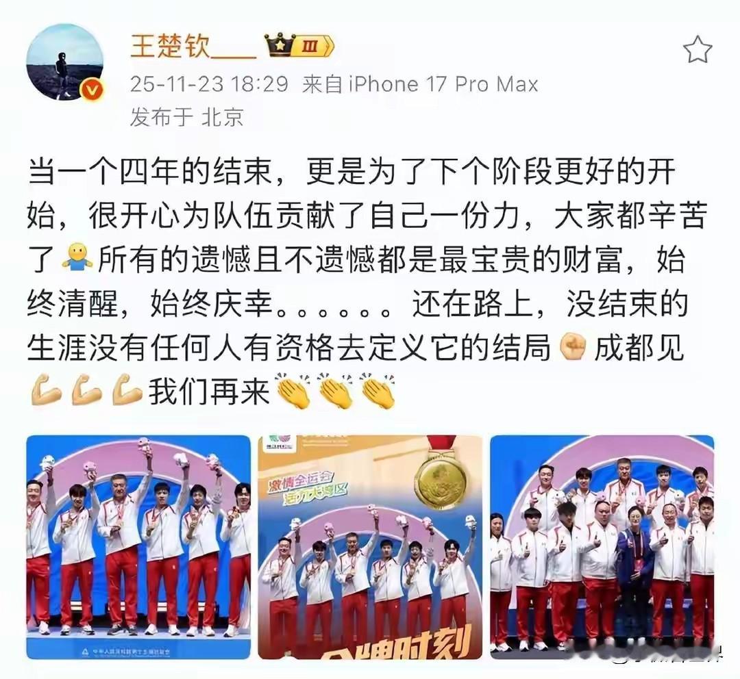全运会乒乓赛才结束,莎莎楚钦却又马上要奔赴新的征程——成都混团世界杯即将开打,他们要提前去成都适应场地准备比赛。 忙里偷闲,今天头哥发微博啦—— “当一个四年的结束,更是为了下个阶段更好的开始,很开心为队伍贡献了自己一份力,大家都辛苦了 所有的遗憾且不遗憾都是最宝贵的财富,始终清醒,始终庆幸。。。。。。还在路上,没结束的生涯没有任何人有资格去定义它的结局[拳头成都见[加油[加[加油我们再来[鼓掌[鼓掌][鼓掌 归纳起来,头哥说了这样几个意思。 第一,这次已结束了,但其实又是崭新的开始,是下个阶段更好的结果的开始。 第二,团体赛冠军里也有我的功劳,很开心为队伍贡献了自己的力量,且付出有回报。 第三,团体赛的胜利,不是个人的胜利,是大家齐心协力的结果,大家都辛苦了!感恩感谢的头哥,始终如一的谦逊有礼。 第四,这次全运会有遗憾,但无论怎样的得失都是人生里最宝贵的财富。头哥清醒着呢! 第五,未来还长,任何人都没有资格定义王楚钦的最后,他会努力,他会证明给大家看! 第六,成都混团马上又要开始了,请大家继续关注国乒比赛,我们从头再来!请继续为我们加油吧! 不得不说头哥太有才了!情商智商双双在线,发个微博就是告诉我们,团体冠军是大家齐心协力的结果,自己也尽力了,但胜败乃兵家常事,一次失利不代表永远失利。 新的征程里,我们就继续为他加油吧!