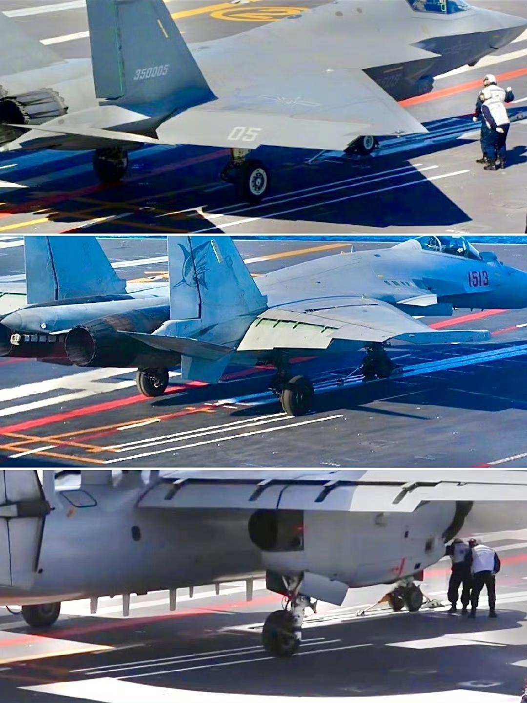 【细节】福建舰弹射小妙招:同一个弹射位上,画了三套白线,用来快速对齐三型固定翼舰载机弹射前的主起落架位置。 感觉还是应该不同长度或者不同宽度的线,平时再熟练战时还是容易出错的。