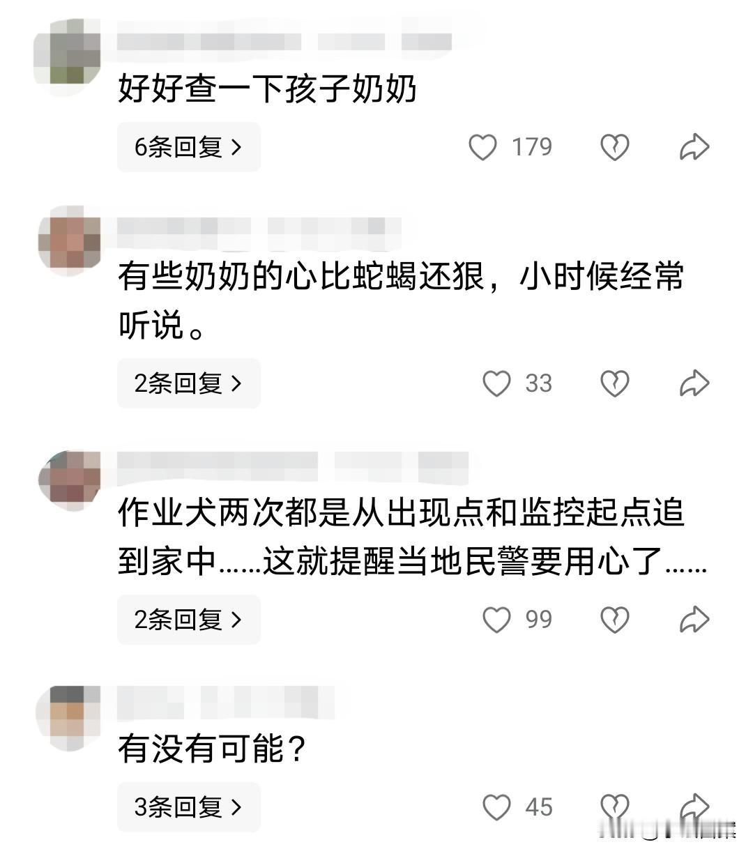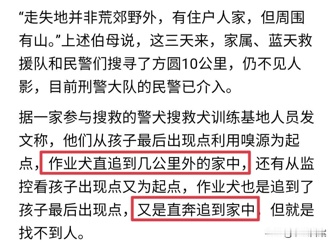 令人揪心!已走失3天河南8岁女童不会说话,奶奶带她去10公里外上坟后出事。周围有积雪、环境温度低,搜救犬行为奇怪,网友们的大胆猜测似乎有些站不住脚。 女童名叫耿子涵,因为智力问题,所以不会说话,11月20日下午随奶奶骑电动车去10公里外的邻村上坟归家途中失踪,这无疑大大增加了搜寻难度。 河南前几天刚下过雪,从现场照片看,余雪未消,如此低的温度,又是一个特殊孩子在接近傍晚失踪,单独在野外过一夜恐怕都有冻毙风险。 事发后,家属、警察和救援队3天下来,搜寻了方圆10公里,却一无所获。小子涵只有那么大,如果是自然走失,估计跑不了多远,这是让人非常困惑的一点。 更让人觉得奇怪是,警方用搜救犬追踪气味,以小涵失踪点为起点,狗狗竟直追几公里远的家中。再用小涵监控中最后出现的位置为起点,狗狗也是直奔家里,但无论如何,人就是找不到。 不少阴谋论网友猜测,会不会是奶奶心思不正,故意让有缺陷的孙女出意外,以此彻底解决“后顾之忧”呢? 这个想法的确很大胆,毕竟去那么远上坟,为何非要带上小涵呢?搜救犬的奇怪行为也是让人浮想联翩。 但仔细想来,不太可能: 一、70多岁的奶奶是小涵的亲奶奶,孙女失踪后,她十分自责,人老心善外加隔辈亲,真有不良目的,不会等到8岁; 二、农历十月初一是寒衣节,北方有上坟送寒衣的祭祀活动,小涵失踪正是这一天,奶奶带她去远处上坟,不是突发奇想; 三、父母要赚钱养家,小涵多半由奶奶带,独自放家里更危险,带去上坟是尊宗敬祖,也能祈求保佑,虽然这种思想有些朴素封建,但奶奶是希望孙女以后过得更好的。 至于搜救犬的奇怪行为,也很好解释: 温度低,气味分子扩散缓慢,刮风会让气味更快消失,低温也会刺激狗狗鼻腔粘膜,使其嗅觉灵敏度降低。 小涵在野外或持续移动、或遇到坏人被带走、或因求生本能钻入草窠石缝御寒,气味微弱、难以持续。但家是小涵长期生活的地方,温度较高、气味浓厚稳定,搜救犬出现偏差,也就不足为奇了。 希望小涵能够早日平安回家!她的失踪带给家人的是痛苦,没有结果之前,大家还是不要胡乱猜测。但倘若真的是心坏致不良悲剧,相信法律也绝不会放过任何一个坏人…… 【关注@小讼言案 ,为您分享更多精彩】 (来源:极目新闻)