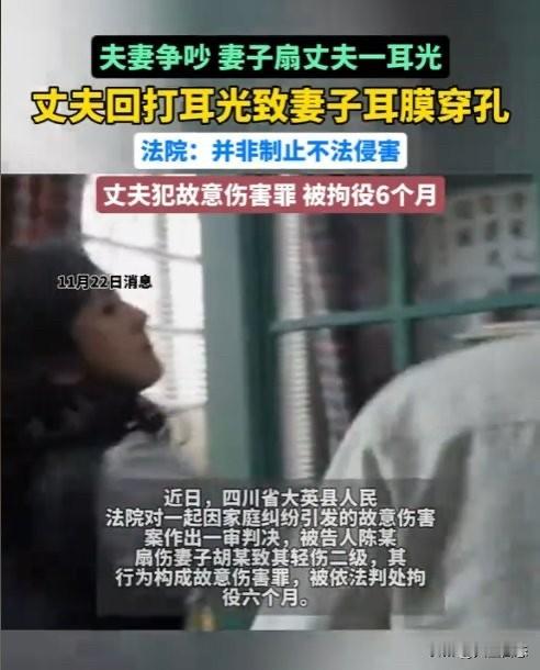 破防了!妻子加班回家,被他一巴掌打穿耳膜,法律不认“谁先动手” 那天晚上八点多,胡女士刚加完班,打电话让丈夫陈某来接自己,陈某说没空让她自己回家,她心里憋着火,到家后情绪没压住,直接抬手打了丈夫一耳光,陈某也火了,回手一巴掌打得挺重,胡女士当场耳朵嗡嗡响,第二天去医院检查,医生说是耳膜穿孔,属于轻伤二级。 医生检查伤口时觉得情况不太对劲,便建议胡女士去报警,警察调查后发现这并非简单争吵,而是确实发生了暴力行为,虽然胡女士先动了手,但那一巴掌没有造成实际伤害,陈某那一掌却直接导致对方轻伤,警方没有接受“正当防卫”的说法,认定这是互殴升级的结果,最终陈某因涉嫌故意伤害被刑事拘留。 陈某始终强调自己只是还手,不是主动打人,但法院和警方都不认同这种说法,他妻子那一下只是发泄情绪,没有威胁到他的人身安全,他完全不必用那么大力气去反击,而且从医学角度来说,耳膜穿孔不是轻轻碰一下就能造成的,得是那种用力拍击才会出现,这说明陈某是有意发力,不是什么下意识的反应,所以这件事不能算防卫,只能算是报复。 这事在四川当地很多人议论,有人说胡女士性格直爽,有点泼辣,是典型的“四川妹子”,平时在家里说话做事都带着冲劲,可法律不管你是哪种性格,也不看你是不是女强人,谁先动手并不重要,重要的是有没有把事闹大,这一巴掌下去,伤到了人,就不再是家务事,而是刑事案件。 过去人们常认为夫妻打架属于家务事,只要没演变成长期家暴或控制行为,就不该动用刑法来管,不过现在情况改变了,最高法去年发布了新指导意见,明确指出偶发性的暴力行为也能构成犯罪,婚姻关系不能成为免责理由,即便只发生一次,只要造成轻伤结果,就要承担刑事责任,陈某被判处六个月拘役算是较轻的处罚,因为他没有前科记录,事后也主动投案自首。 胡女士没有撤销案件,按照常理夫妻之间很多人会选和解,但她没有这样做,可能两人早就积累了很多矛盾,这次只是爆发点,陈某也没有认错,一直坚持自己是正当防卫,结果调解进行不下去,案子就这样一路到了法院,最后判了刑,婚姻也保不住了。 这个案子没有提到孩子的问题,也没有涉及财产分割,看起来只是两个人在情绪上互相较劲,一方觉得自己受了委屈没人管,另一方觉得被冒犯了必须还手,结果谁也没占到便宜,法律不会因为他们是夫妻就特别宽容,也不会因为谁先动手就原谅谁,打人就是打人,伤了别人就要承担责任,这件事表面上是家庭内部的矛盾,实际上已经超出了家庭的范畴,变成了一个公共事件。 我实在感到感慨,现在夫妻吵架很容易动手,以为只是小事,等到真正出事才后悔,特别是那种你打我一下、我还你一下的想法,法律根本不会认可,就算再有道理,也不能靠暴力解决问题,这一巴掌下去,可能打穿耳膜,毁掉婚姻,甚至让人失去自由。