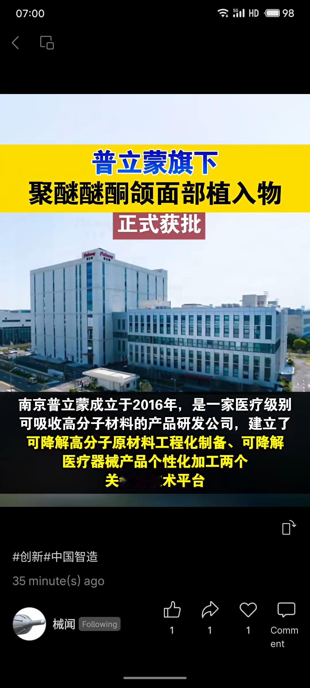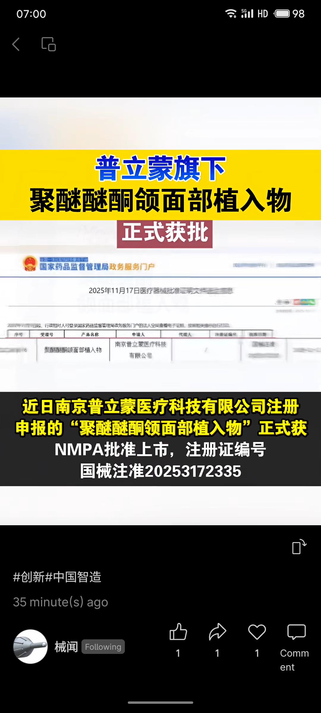 南京普立蒙医疗科技有限公司研发的“聚醚醚酮颌面部植入物”,已于2025年11月17日正式获得国家药品监督管理局批准上市。该产品由高性能材料制成,具有良好的组织相容性和强度,标志着国产高端医疗器械领域的新突破。