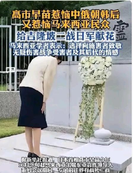 高市在马来给日军“慰灵碑”献花,这事一下子就在网上炸开了锅! 她对日军侵略暴行一字未提! 她对外宣称自己是“在历史中汲取经验”,但对当年日军侵略时犯下的那些暴行,一个字都没提。马来西亚有学者气愤地批评:这简直是在给那些曾经遭受苦难的人又添了一道伤疤! 东京市中心的街道上,好几百市民聚集在一起,手里都举着“高市早苗辞职”的牌子,就是想让她把之前说的那些关于台湾的错误话收回去。现场有位头发都白了的大爷气得直跺脚,对着人群喊:“这种想美化军国主义的话,简直太吓人了!”大家的抗议声一句接一句,没停过,连那些不执政的政党领导人都特地来现场支持大家。 更让人觉得讽刺的是,日本旅游业已经开始自己挖坑了。来日本旅游的中国人少了一大截,开店的老板们愁得不行。有个开小铺的老板直接抱怨:“政客们瞎说话,凭什么让我们这些普通老百姓来承担后果啊?”有专家提醒,要是总想着改历史,最后肯定会自己害了自己。 对于这种回避历史、美化错误的做法,你觉得应该怎么看呢?
