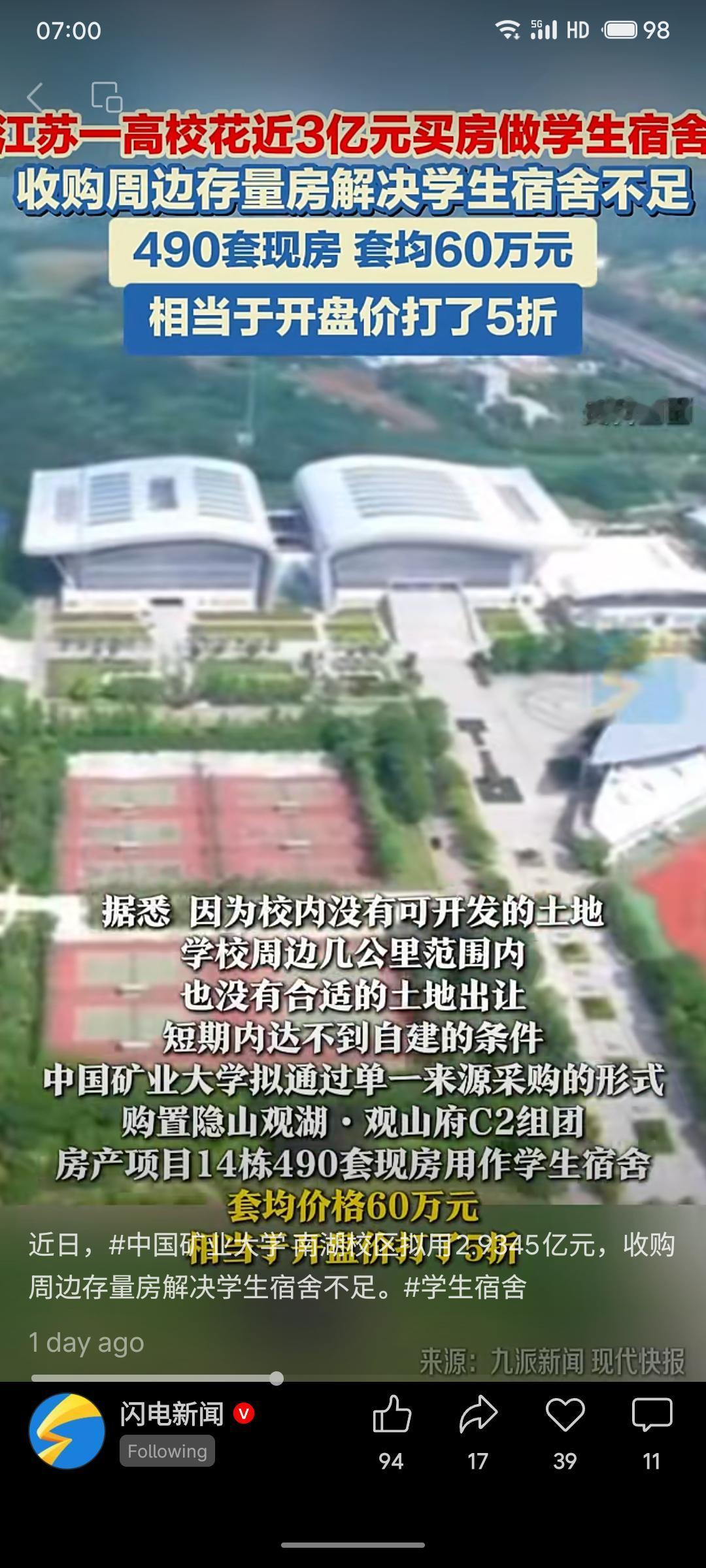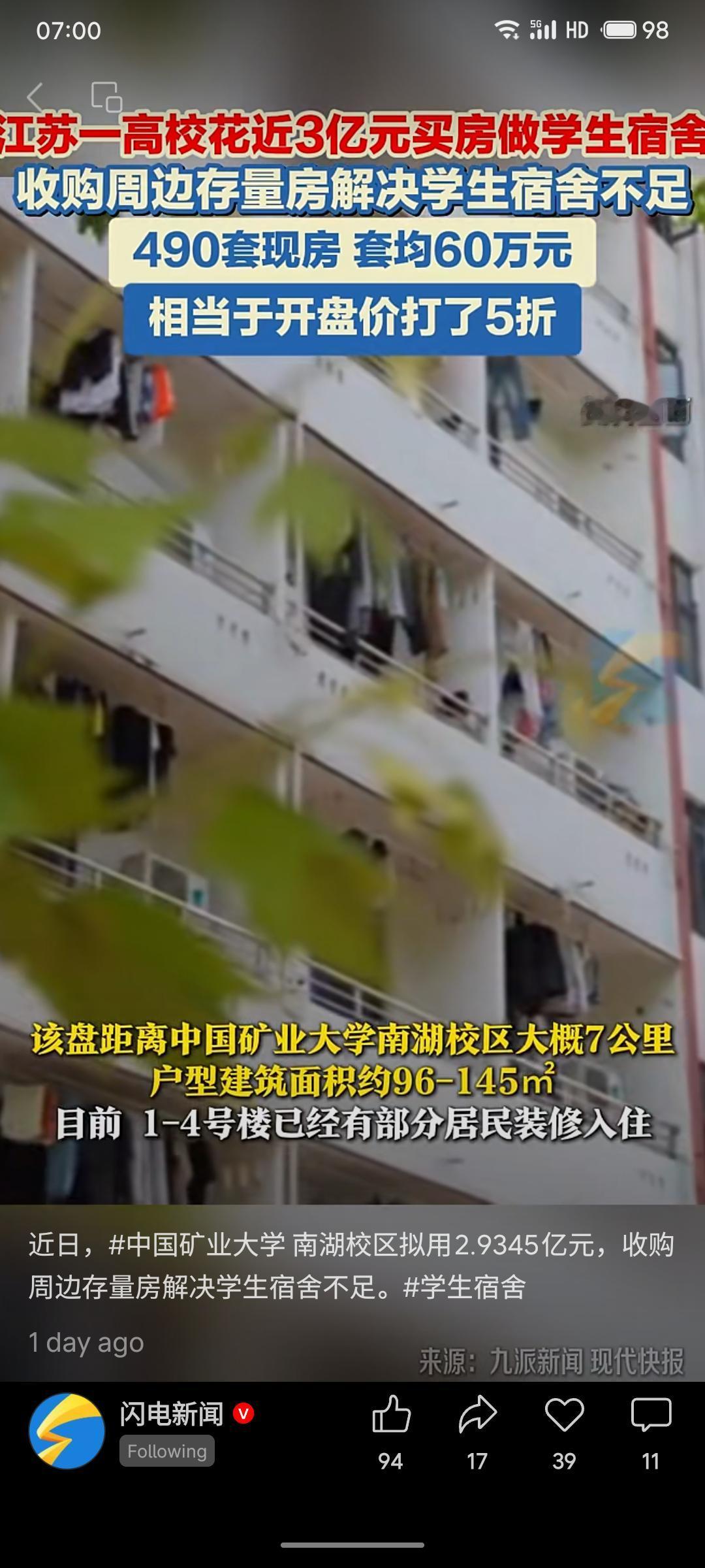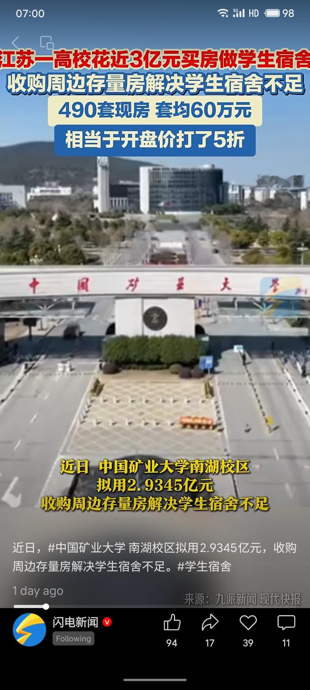 中国矿业大学南湖校区拟投入2.9345亿元,收购距离校区约7公里的某楼盘490套现房作为学生宿舍,以解决宿舍不足问题。该批房源套均价格约60万元,相当于以开盘价五折购入。