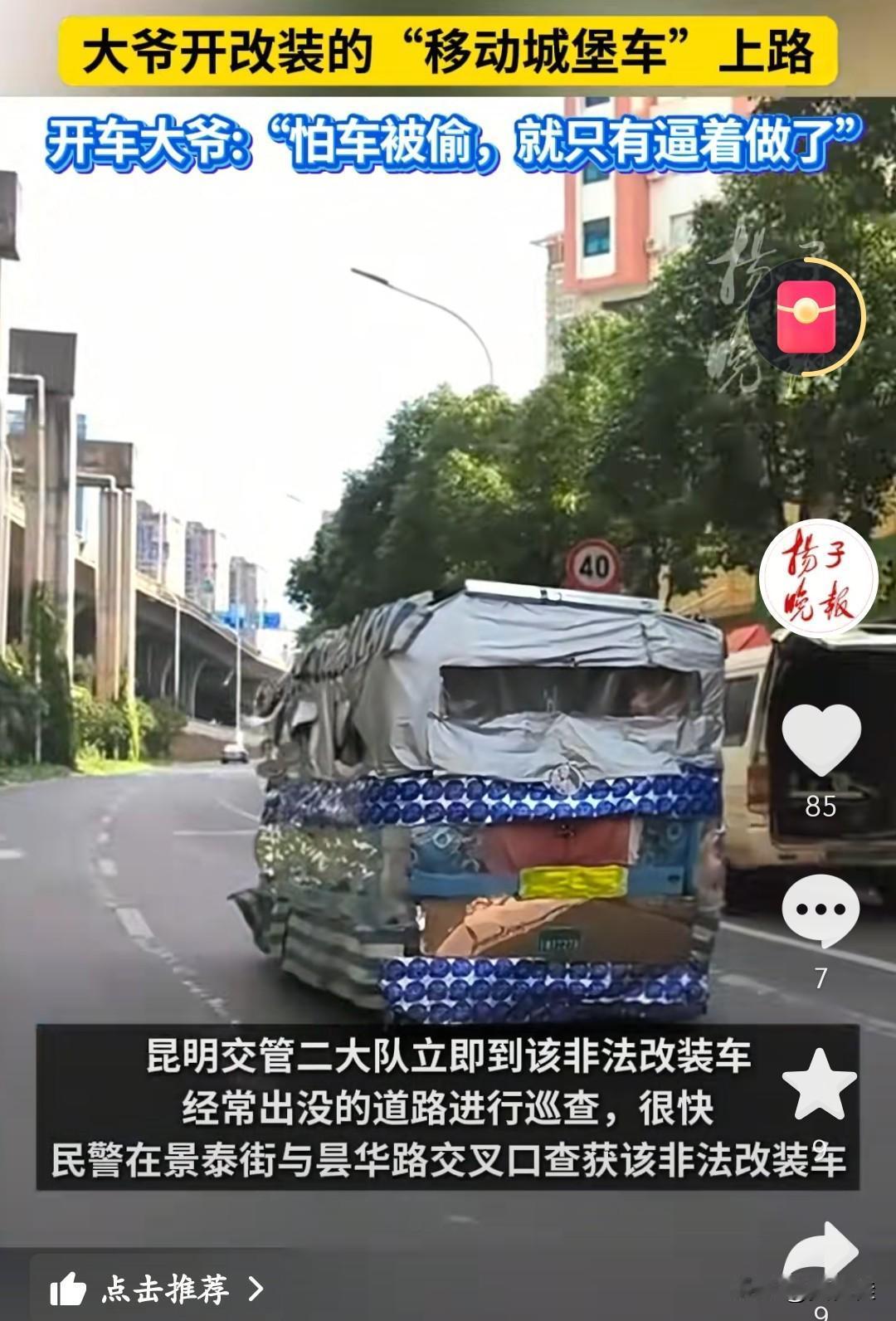 大爷说“怕车被偷,逼得这么改”,结果一上路就被市民举报——这造型搁街上比红绿灯还扎眼。交警没费劲儿就把“城堡车”截了,网友乐疯:“还以为是印度街头限定,没想到是咱本土狠活!” 虽说大爷防偷心切,但这车改得连亲妈都认不出,安全隐患直接拉满,上路属实不靠谱!