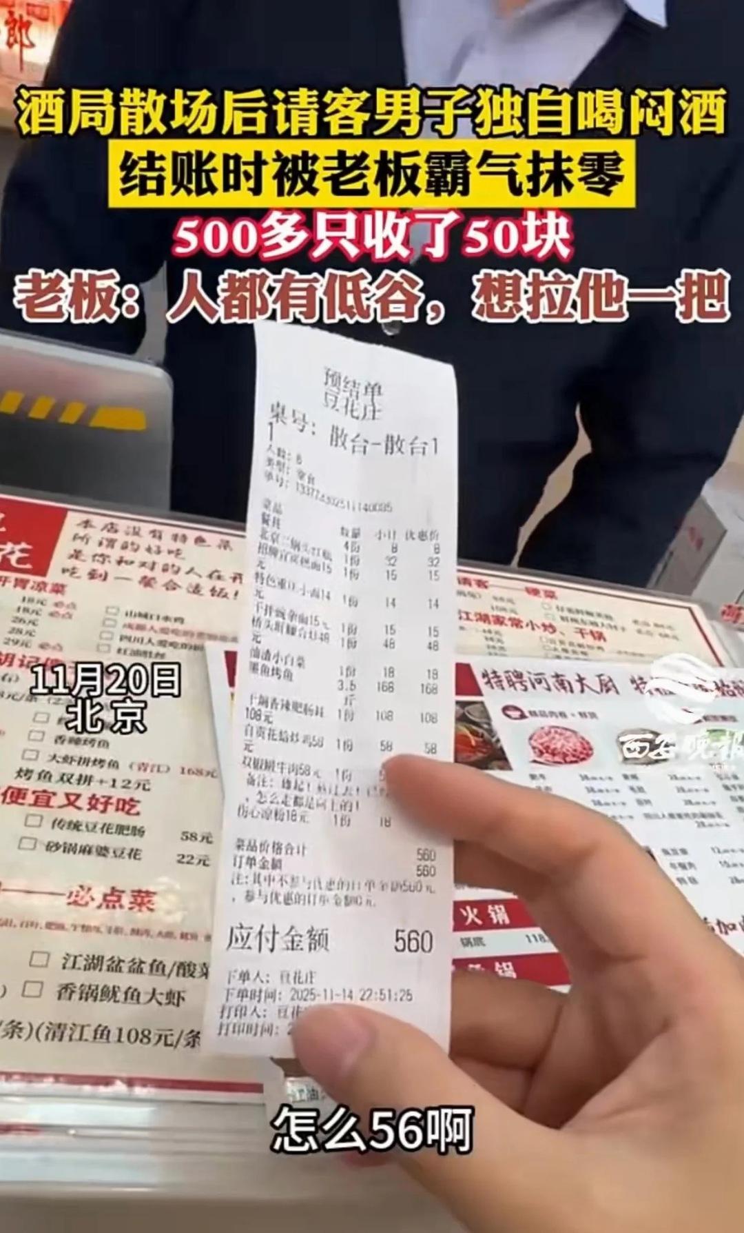 格局打开了!北京老板560抹零到56,一句话看哭无数人:你宴请的,是当年的自己 格局打开了!北京一个男子请人吃饭,吃了560,结账的时候老板却只收了56,男子还以为老板认识自己,没想到老板一句话让他感动的说不出话来。男子这天之所以请别人吃饭,是因为经济上遇到了困难,而他请的人都是之前欠了他钱的人。所以他好吃好喝供着,就是想把钱要回来。 可这些人一听说要还钱,饭都不想吃了,立马就走了。酒桌上瞬间从热热闹闹变成冷冷清清,满桌的菜没动几口,只剩下男子一个人对着空座位发呆。他拿起酒杯一口闷,酒的辛辣呛得他鼻子发酸,心里更酸——当初这些人有难处时,他二话不说借钱解围,如今自己急着周转,换来的却是避之不及的冷漠。无奈之下,男子只能自己一个人在那喝闷酒,越喝越觉得寒心。 老板正是看到了这一幕,悄悄在旁边观察了好久,看着男子落寞的背影,想起了自己当年的遭遇,才决定帮男子一把,所以直接霸气抹零,把560抹成了56。 男子拿着账单愣了半天,反复确认:“老板,你是不是算错了?”老板笑着摆手:“没算错,就收你56。”男子更纳闷了:“咱们认识吗?”老板的一句话,让他瞬间红了眼眶,感动得说不出话来:“人活一辈子,谁没有不如意的时候呢?我早几年生意失败,欠了一屁股债,也是被人追着要账,那种走投无路的滋味,我太懂了。” 老板的想法也很实在,他当年落魄时,也曾遇到过陌生人的举手之劳,一句鼓励、一顿热饭,就让他撑过了最难的日子。如今自己日子好过了,就想把这份善意传下去:“你今天请的是欠你钱的人,可我觉得,你宴请的是当年愿意真心帮人的自己。我这点举手之劳,就是想给身在低谷期的你照进一束光,让你知道,这世上还是有温暖的。” 网友看完纷纷留言:“对比太扎心了!欠账的人翻脸比翻书快,陌生的老板却雪中送炭”“这哪是抹零啊,这是给绝境中的人留了体面”“善良真的会传染,老板当年被温暖过,如今又成为了别人的光”。 人这一辈子,谁还没个难的时候?锦上添花易,雪中送炭难。那些在你低谷时不离不弃的,往往不是你曾帮过的人;而那些素不相识的善意,却总能在寒冬里暖透人心。老板的56块钱,不仅是一顿饭钱,更是对人性的信任,对善良的坚守。愿我们都能做个温暖的人,在别人需要时搭把手,因为你今天帮的,可能就是明天的自己。 你有没有遇到过陌生人的善意?欢迎在评论区分享你的故事,让温暖传递下去~热点话题