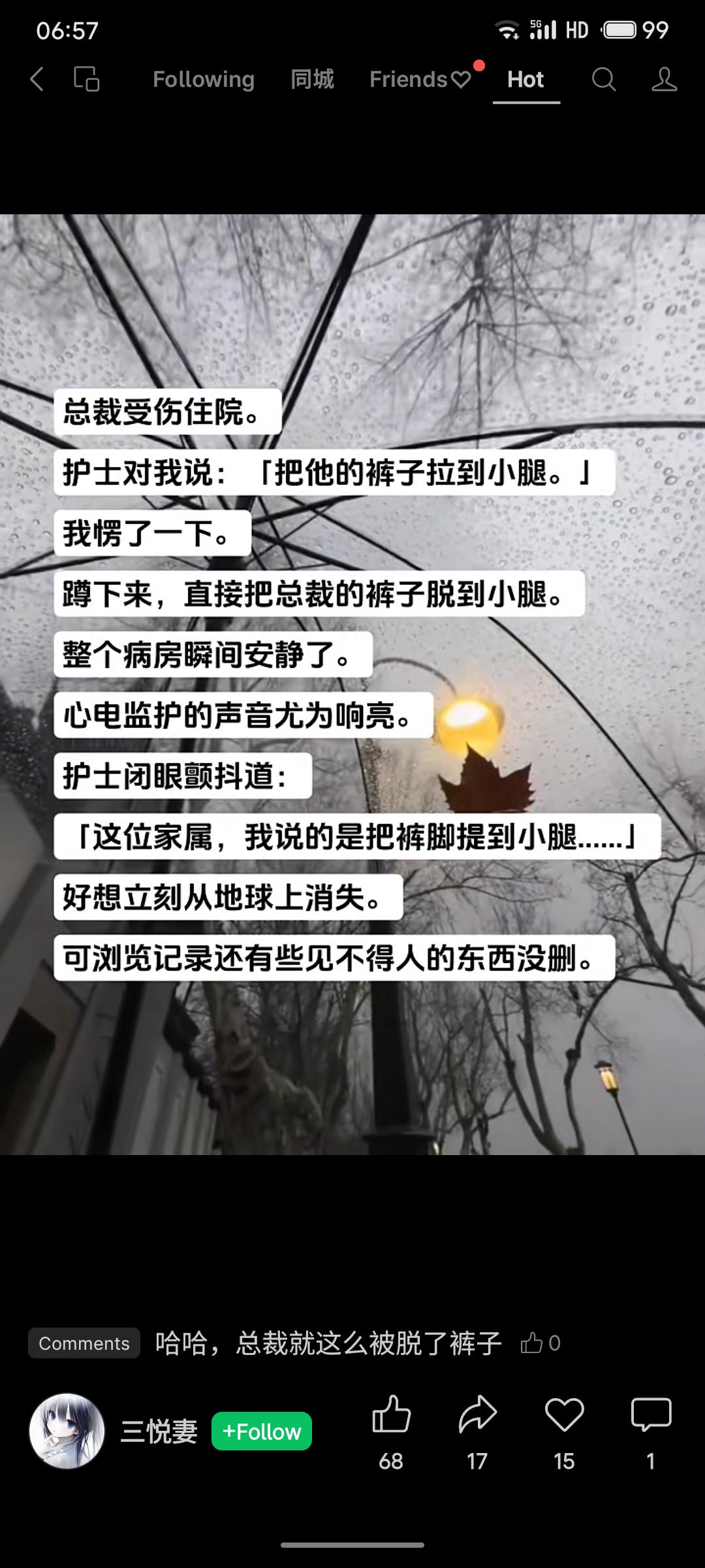 陪护者因误解护士“把裤脚提到小腿”的指令,不慎将住院总裁的裤子脱至小腿,场面一度尴尬。护士随后澄清本意是卷起裤脚,令当事人窘迫不已。