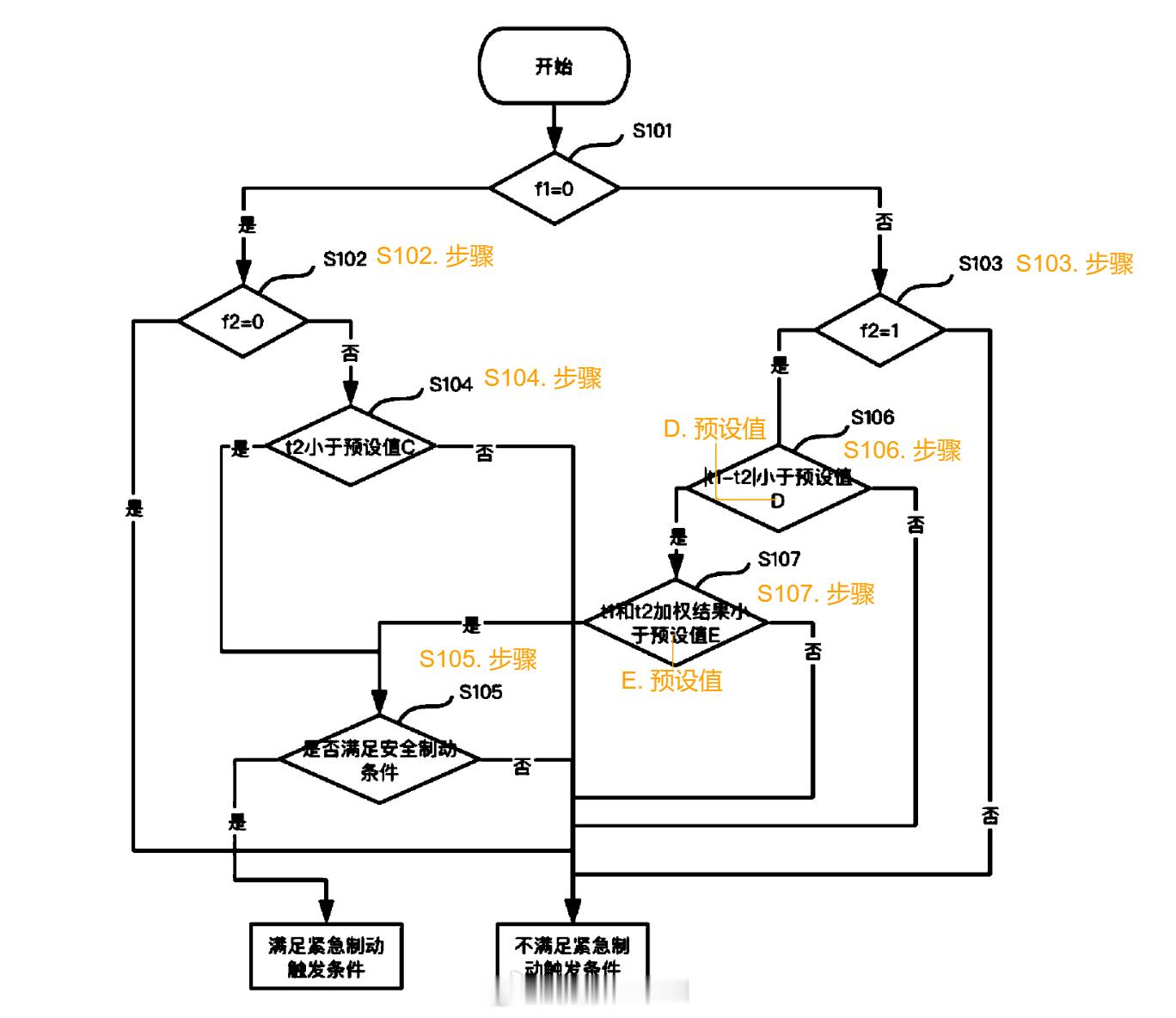 今天聊聊AEB这个功能。有些人认为AEB就是遥控器,按下汽车就能立刻停止。这个逻辑是错误的,AEB的全程是自动紧急制动系统,本质上,它是在紧急情况下帮助人踩刹车。既然说踩刹车,AEB的灵敏度就很重要了。这就体现在几个维度:1、踩下刹车的“意愿”:如果前面看到任何疑似障碍物都要踩刹车,那肯定会很恼火;展开说就是:灵敏度过高可能导致误刹车,过低则可能无法及时避免碰撞。影响这个“意愿”的信息有很多,尤其是汽车到底能不能看的“清”。所以我们才会去区分,哪些车的AEB是摄像头的,哪些车是多种传感器联动的,最好还能有激光雷达的。再来一点,数据处理算法也很关键。 算法需要快速、准确地识别并跟踪前方车辆、行人、自行车等潜在障碍物。基于障碍物的速度、距离、相对运动轨迹等信息,评估碰撞风险。下图1-4就是一个很典型的工作流程。它的逻辑是:获取第一特定信息和第二特定信息;根据所述第一特定信息和已知的整车数据得到第一预计碰撞时间t1和第一碰撞危险标志位f1,并根据第二特定信息和已知的整车数据得到第二预计碰撞时间t2和第二碰撞危险标志位f2;根据t1、t2、f1、f2判断是否满足紧急制动触发条件,当满足条件时进行紧急制动,当不满足条件时不进行紧急制动。2、踩下刹车的力度:AEB的刹车力度需要分级处理。展开说就是:根据碰撞风险等级,决定是否采取预警、部分制动或全力制动。需要补充一点, 制动系统的响应速度和制动力直接影响AEB的效果。所以即便是同一台车,在不同的路况下,刹停能力也会有所不同。再来一点,由于AEB这种“犹豫机制”,它的实时调整就很重要了。但当车辆进行制动时,车辆发生纵摇运动,车辆的前面部向地面倾斜,从而前方传感器的方向也向地面方向倾斜。若前方雷达因这种倾斜而错过危险车辆,则AEB系统可能会判断为前方的碰撞危险状况已结束而结束自动制动,导致与前方车辆的碰撞。所以能否解决这个问题就是各家的技术分水岭了。水平高的车企,如果车辆的制动中发生车辆的纵摇运动,是可以通过调整传感器模块的信号发射方向,进而提高对前方车辆的感知性能。3、踩下刹车的时机:高速行驶能否触发AEB一直是争议的话题。过去AEB的触发上限被定在70km/h左右,但现在甚至出现了120km/h就可以触发的AEB。展开说就是:由于车速越高,相同的距离对应的制动时间越短,对AEB的响应速度要求越高。要解决这个问题,一方面我们需要感知系统更强大,能越早看见危险越好。但同时,车子本身的刹停能力考验也会更大。解决思路最常见的是,通过在AEB系统中调整控制器的参数,根据车辆实时速度和目标减速度调整比例-积分控制器的系数,结合前馈控制,解决常规AEB系统在不同车速下响应时间和减速超调量差异的问题。但不管怎么说,大家要注意了,AEB是被定义在L2级别的辅助驾驶功能,从L2的定义看,它还是需要人作为主导的,所以这个配置并不是让你完全撒手不管。