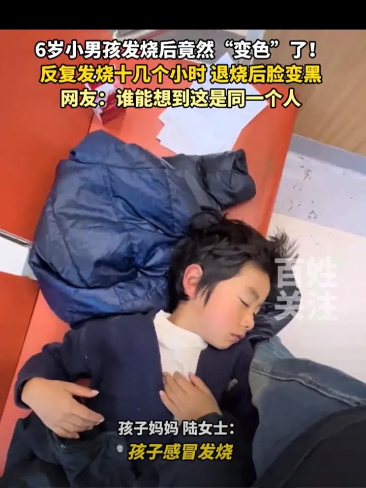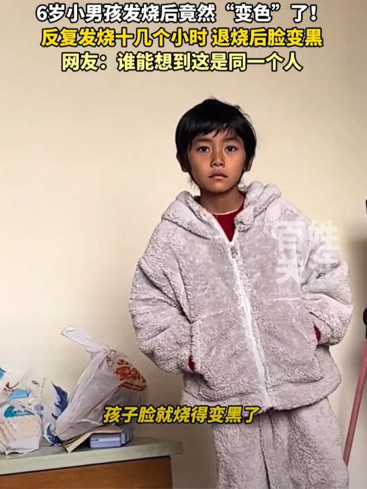 “这下解释不清了!”湖南衡阳,一名6岁小男孩突然发高烧,最高时烧到40度,妈妈心疼的不行,十几个小时后,孩子情况总算稳定了下来,可孩子的肤色却从上午的白幼瘦变成了黑幼瘦,不知道的还以为孩子在海边玩了一周刚回来。 孩子的母亲陆女士介绍,孩子下午发烧时是38.5度,到了凌晨最高达到了40度,孩子又是吃药,又是打针,但发烧的情况反反复复,甚至脸都变黑了。 现在孩子烧倒是退了,但肤色却回不去了,之前白白嫩嫩的孩子,现在就好像一个混血娃,妈妈也不清楚是什么情况,于是把这个事发到网上。 有网友开玩笑说:因为发烧烤焦,所以黑了,晒晒太阳,冰棍一样融化,就白了。 也有网友分析:皮肤代谢加快,氧化成黑色的。想想黑头的形成。只不过孩子本来新陈代谢就快,再加上发烧,加速了细胞增殖的速度。 其实这个说法还是有道理的,小孩皮肤变深这事,说大不大,说小也不小。家长最担心的无非两点,一是是不是身体还有问题,二是能不能恢复。 网友的玩笑看着乐呵,分析也有点道理,但在孩子健康面前,真没必要猜来猜去赌运气。小孩子高烧到40度本就凶险,肤色突然大变肯定不是正常现象,说不定是身体在发出信号。 与其在网上等网友出主意,不如直接带娃去医院做个检查,让医生专业判断,既放心又省心。家长心疼孩子能理解,但可别因一时侥幸耽误事,毕竟孩子的身体经不起折腾,早检查早安心,真有问题也能及时处理。皮肤能不能白回来是小事,确保孩子身体没隐患才是重中之重。各位读者你们怎么看?欢迎在评论区讨论。
