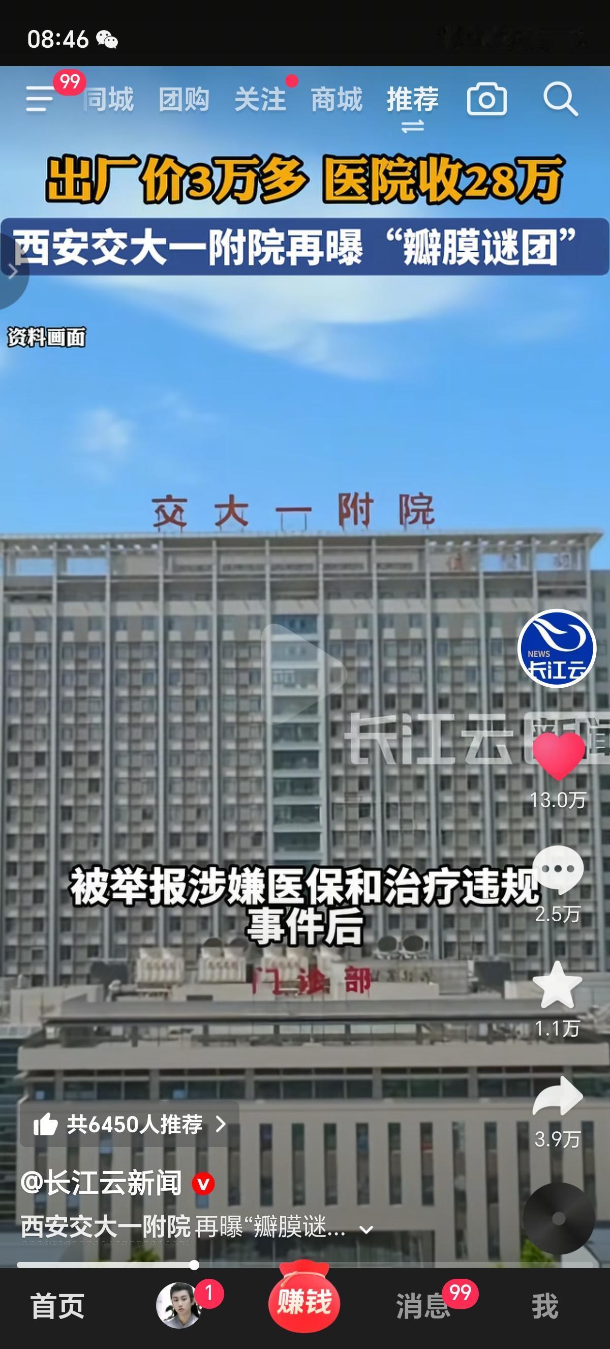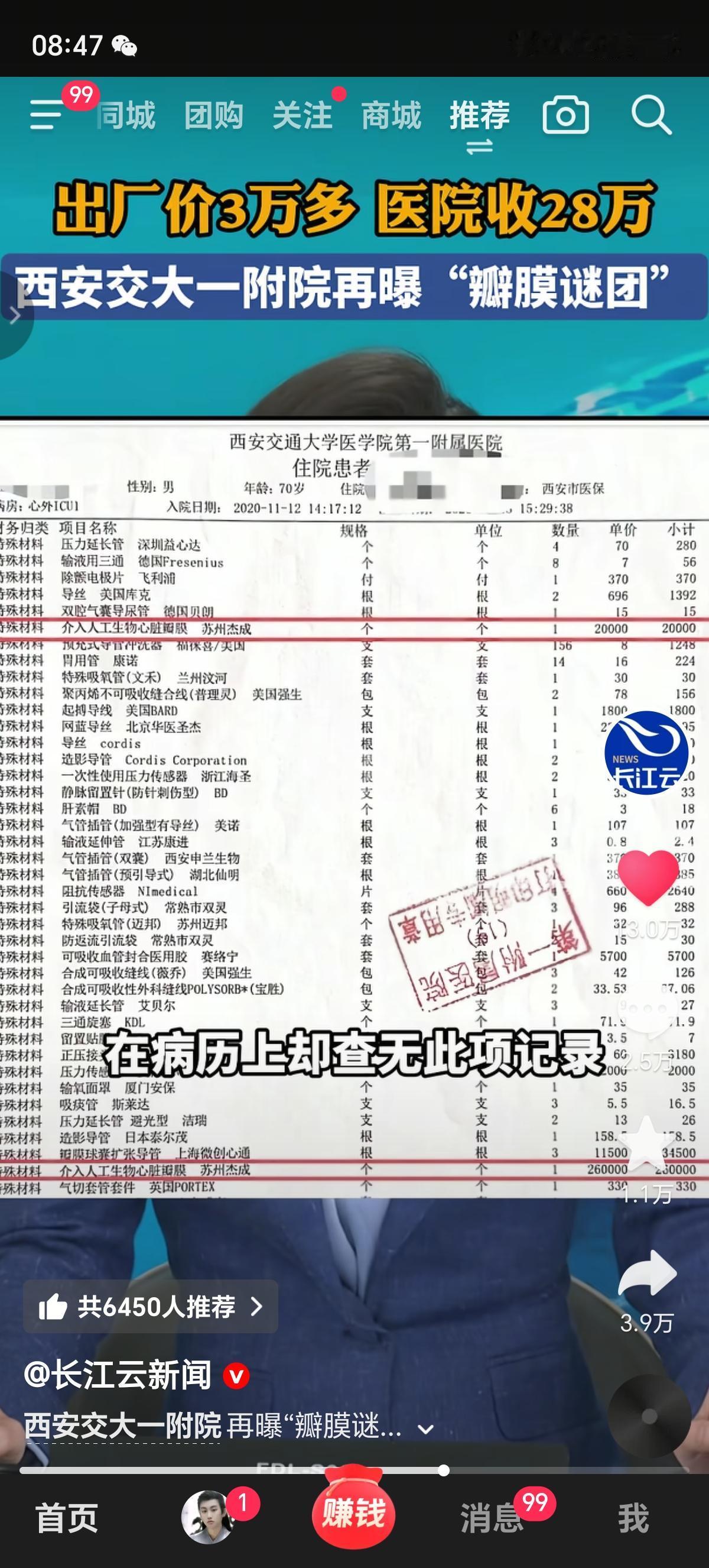 西安交大一附院,瓣膜出厂价3万多,医院收费28万,全额自费项目不通知家属,医保一分不报。植入2个瓣膜,病历只记载一个瓣膜标签。 一颗心脏瓣膜,出厂价3万余元,到患者手中竟飙至28万!西安交通大学第一附属医院的“瓣膜谜团”,撕开了医疗耗材暴利的遮羞布,更寒了无数患者的心。 术前告知费用约10万,术后总花费飙升至61万,其中单枚瓣膜收费28万且全额自费,医保一分不报——这不是科幻剧情,而是李女士父亲的真实遭遇。更令人震惊的是,市场监管部门调取的发票显示,这款由苏州杰成医疗生产的瓣膜,经销商采购价仅3.8万余元,其中核心组件自膨胀介入瓣膜单价35398元,经心尖介入器仅2528元。近7倍加价,25万的差价,成了压在患者家庭身上的沉重负担。 比天价收费更离谱的是“消失的瓣膜”与被剥夺的知情权。手术中第一枚瓣膜植入失败后,医生未告知家属也未取出,擅自植入第二枚,而这枚“查无来源”的瓣膜竟未记录在病历中。医院给出的荒唐解释是“未收费就无需张贴标签”,却不知《医疗器械临床使用管理办法》明确规定,植入人体的医疗器械必须如实记载信息,与是否收费无关。这枚“隐身”的瓣膜,让后续医疗鉴定受阻,也让患者的心脏成了无法溯源的“试验场”。 比天价收费更离谱的是“消失的瓣膜”与被剥夺的知情权。手术中第一枚瓣膜植入失败后,医生未告知家属也未取出,擅自植入第二枚,而这枚“查无来源”的瓣膜竟未记录在病历中。医院给出的荒唐解释是“未收费就无需张贴标签”,却不知《医疗器械临床使用管理办法》明确规定,植入人体的医疗器械必须如实记载信息,与是否收费无关。这枚“隐身”的瓣膜,让后续医疗鉴定受阻,也让患者的心脏成了无法溯源的“试验场”。 法院已推定医院存在过错,但这场跨越四年的纠纷仍未落幕。25万的差价去向何方?“查无来源”的瓣膜是否合格?医疗耗材的暴利链条何时才能斩断?这些问题需要一个公平正义的答案。