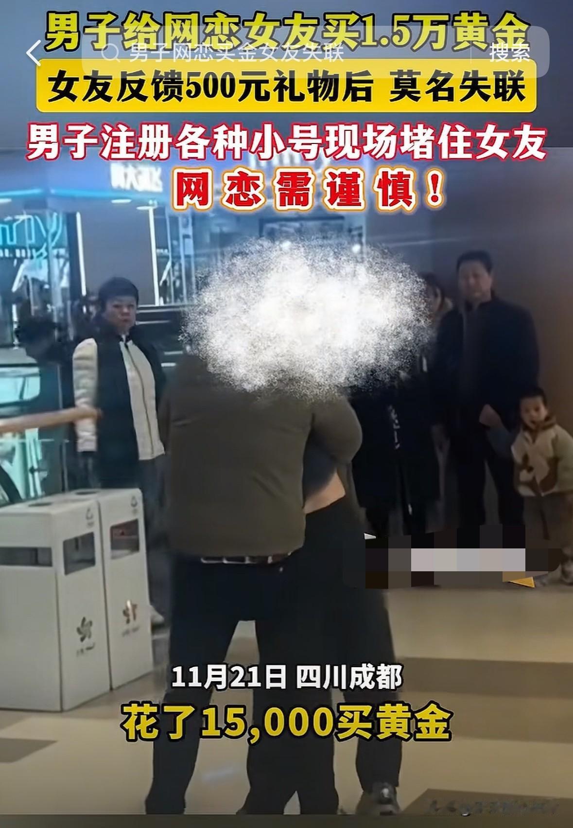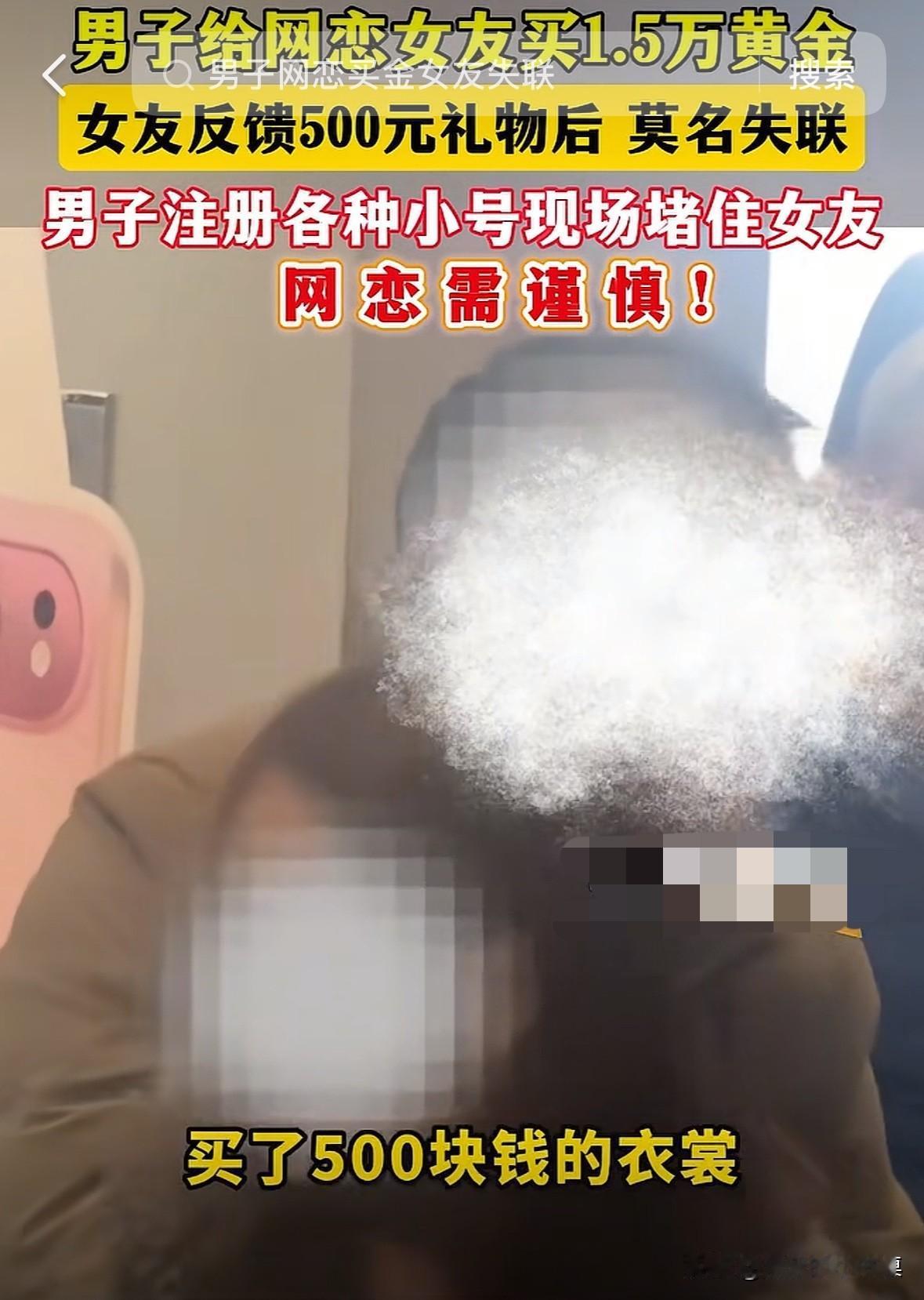 大哥见网恋女友,刚见面,就给网恋女友买了15000元的黄金。 网恋女友也给大哥买了500块钱的衣服,作为回礼。 随后女子就把大哥的所有联系方式拉黑删除! 大哥怎么都联系不上她。 意识到被骗的大哥,于是注册了各种小号,添加女子,最终把女子成功约出来。 女子看到是大哥后,撒腿就跑,但是还是被大哥抓住了。 这时候很多围观群众围了上来,大哥大声说:“刚见面我就给他买了15000元的黄金,然后她的联系方式全是假的!” 女子也狡辩说:“电话我没用过,我没给你买衣服吗?” 500块钱换15000你这骗子好手段啊! 建议大哥直接把她送到警察局去,这女的应该是个诈骗惯犯,肯定有案底,让她还钱并调查她,让她坐牢。网恋赠物要还吗 网恋女友