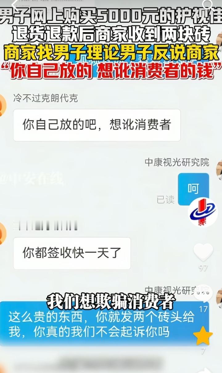 白嫖失败了?四川,男子花5000元在网上购买了两个护视佳,而后又申请退款退货,商家收到男子退货后全程录视频拆包装,结果发现退回来的货是两块砖头,商家找男子理论,结果男子反说商家“你自己放的吧!想讹消费者”。 商家警惕性还是非常高的,要不是拆快递的时候录制视频了,这还真是说不清了。 男子自以为自己聪明这样可以白嫖护视佳,殊不知“魔高一尺道高一丈”,最终事情还是败露了。 在证据面前男子想耍赖也没用,要么道歉赔偿,要么就等着商家起诉。 害人之心不可有,防人之心不可无,收到贵重物品不管是商家还是消费者,为了谨慎期间拆的时候尽量还是录制视频为证。