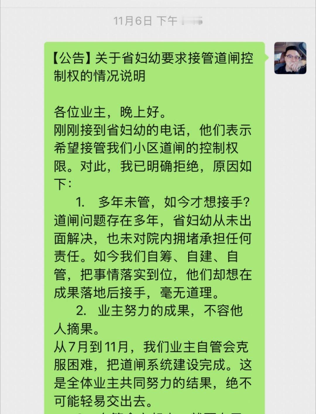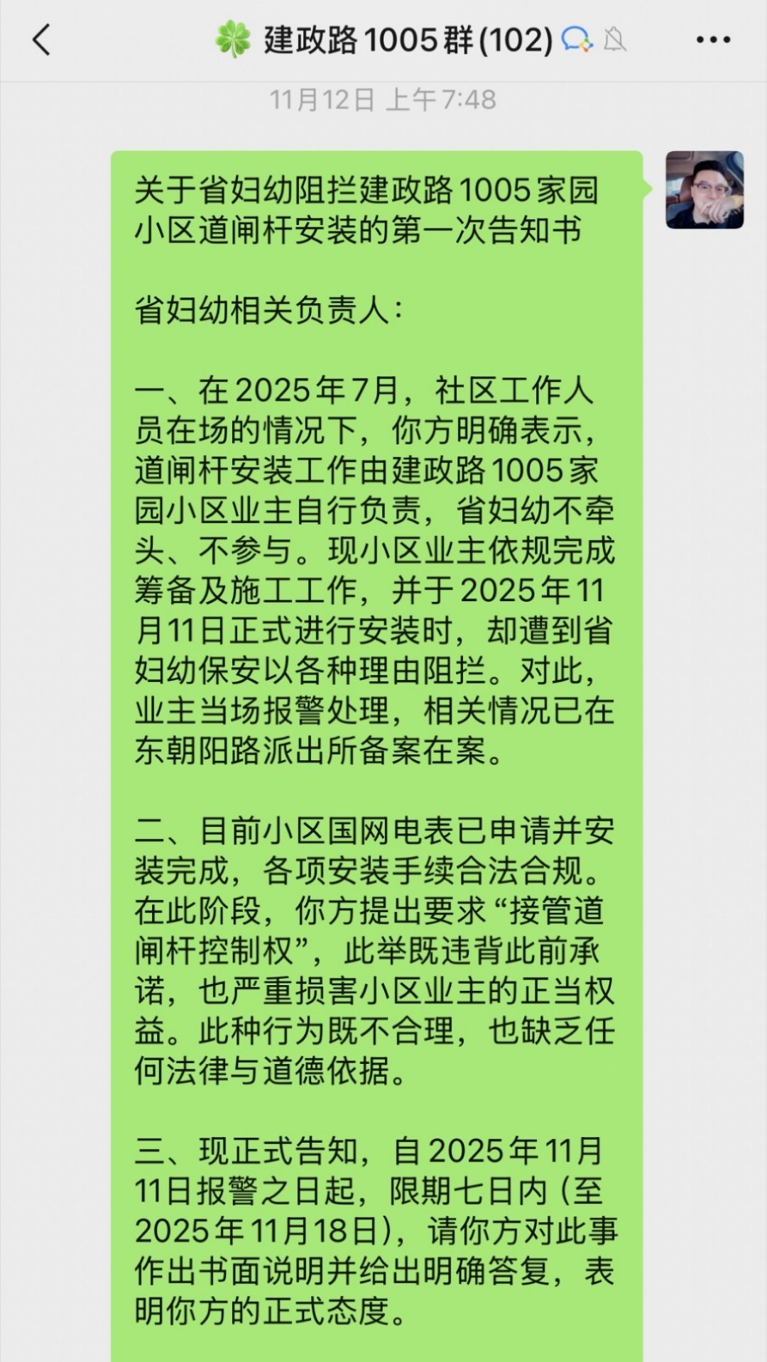【省妇幼做法合理吗】网友曝光:我们小区是建政路1005家园小区,因为一楼是省妇幼的行政办公区,平时就诊患者占用我们小区的停车位置,后来我们业主商定,在前后门安装道闸杆,来缓解业主停车难的问题。由于一楼是省妇幼的行政办公区,所以我们业主跟社区共同跟省妇幼探讨过安装道闸杆的问题,当时省妇幼明确表态,他们不牵头,由我们业主来,后来我们小区在社区的帮助下成立了小区自管委员会。我们马上就安装了,他们却让保安阻拦,导致至今不能安装。我们已经同意给他八个车位,但是他们想要道闸杆控制权,这个我们不能同意的。