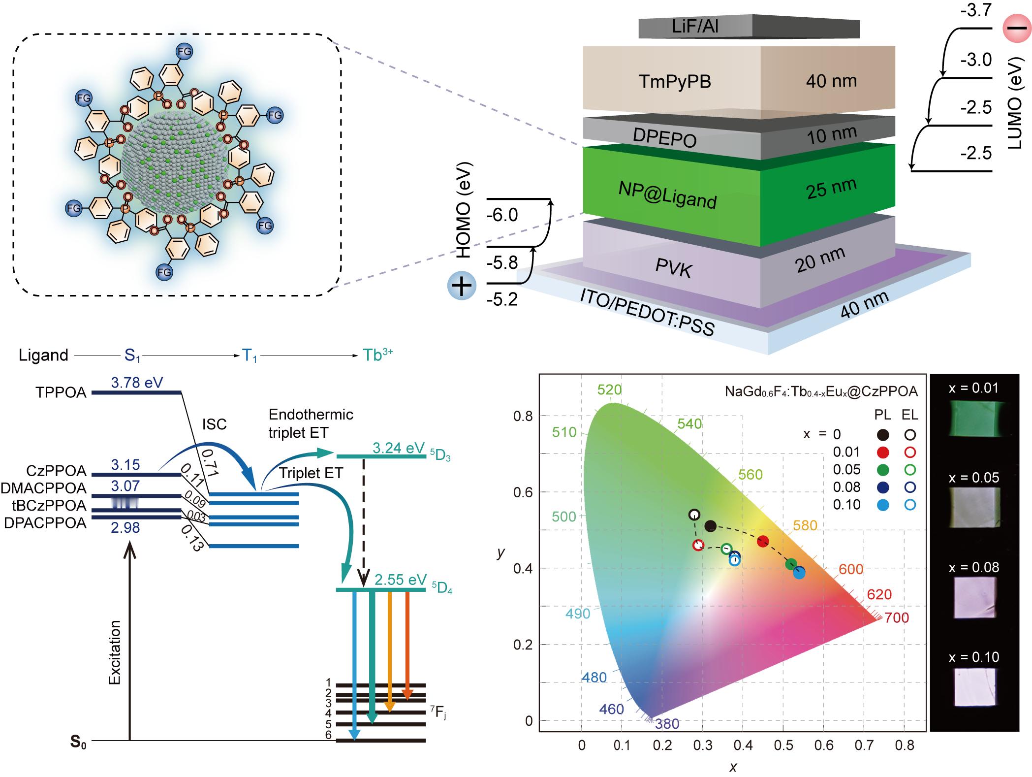 【我国稀土材料最新科研成果:成功攻克绝缘性稀土纳米晶的高效电致发光这一世界难题】 11月24日消息,据央视,近日,黑龙江大学、清华大学和新加坡国立大学合作完成的突破性研究成果在《Nature》正式发表,成功攻克绝缘性稀土纳米晶的高效电致发光这一世界难题。该研究为实现我国稀土资源从“原料出口”向“高附加值技术输出”的战略转型提供了关键核心技术支撑。镧系掺杂纳米晶虽具备色纯度高、稳定性好等作为理想发光材料的优异特性,却因固有的“绝缘”特性无法被电流直接点亮,其高价值光电应用长期受阻。面对这一制约稀土材料迈向高端应用的瓶颈,研究团队开创性地提出有机半导体敏化策略,以功能化有机配体作为“光电桥梁”,成功将能量精准高效地传递给绝缘稀土纳米晶,实现了电流驱动下的高效发光。该技术展现出巨大应用潜力:电致发光器件效率提升76倍,并可在单一器件中通过稀土离子调控实现全光谱发光。这标志着我国在稀土高端光电应用领域取得关键突破,为发展自主可控的超高清显示、近红外通信、生物医疗等新一代信息技术提供了全新材料体系。