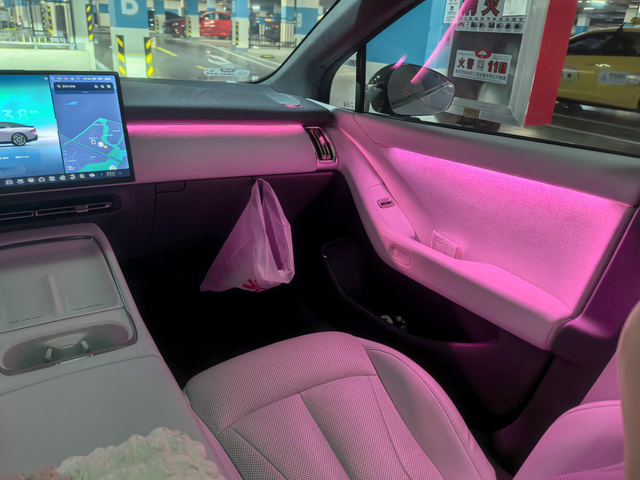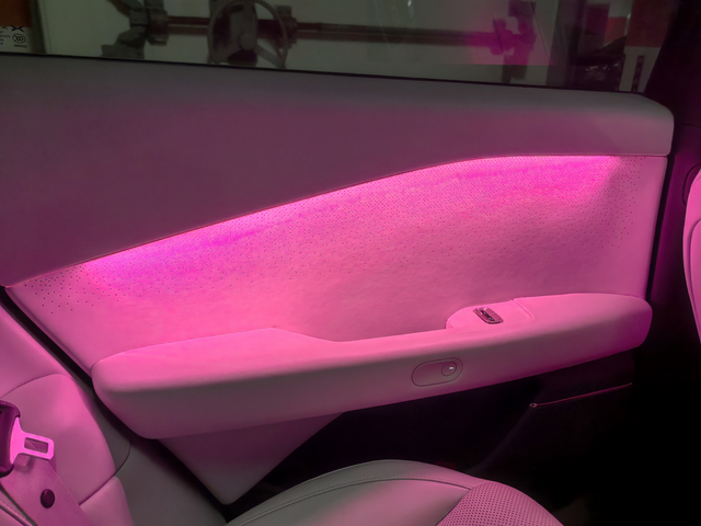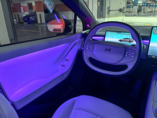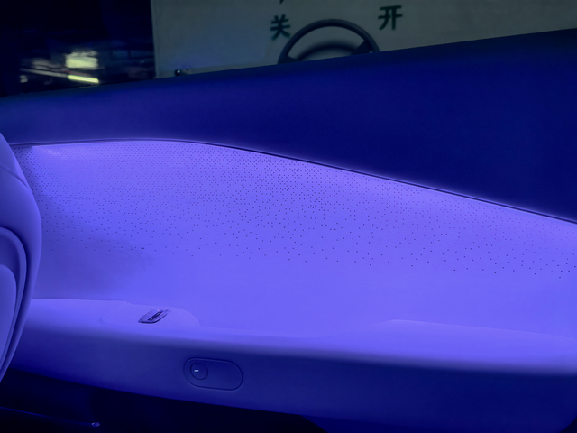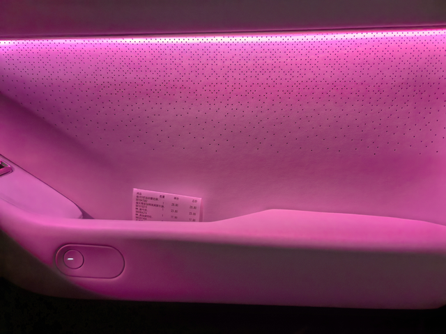 提供情绪价值的车内氛围灯 小鹏P7+的瀑布式氛围灯,灯带是隐藏在门板上部的,和传统氛围灯不一样,它不是线型的,而是面状的,发光面积比较大,还可以选择双色交替变换,随音乐律动等模式