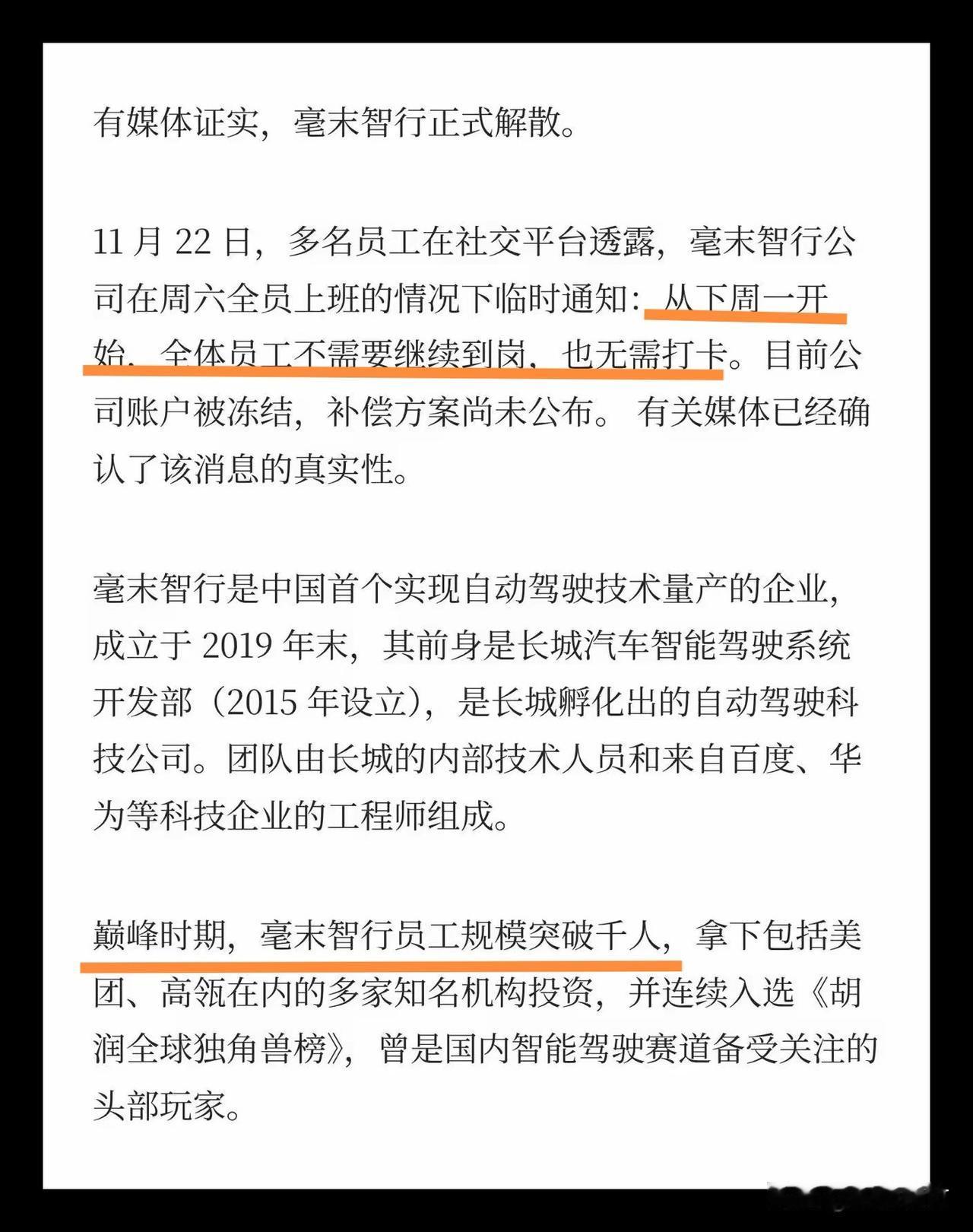 毫末智行解散!智能驾驶企业倒闭潮来临! 这两年死的智能驾驶企业数都数不过来了吧,这不又一家走上了这条路,而且还是背靠大山的大企业。毫末智行这样的都能倒,就更不用说那些夹缝中生存的无依无靠的初创公司了。传统车企搞智驾现在就没成功的,事实证明这条路没法走。 现在智驾行业的形势就是华为、魔门塔、再加新势力自研三分天下了,类似小鹏、理想这些自研的还能存活多久,都还不好说。 随着各家纷纷向华为投诚,最后会不会走向华为一家独大呢?这对行业发展来说未必是好事,少了竞争,一个行业就会失去活力。