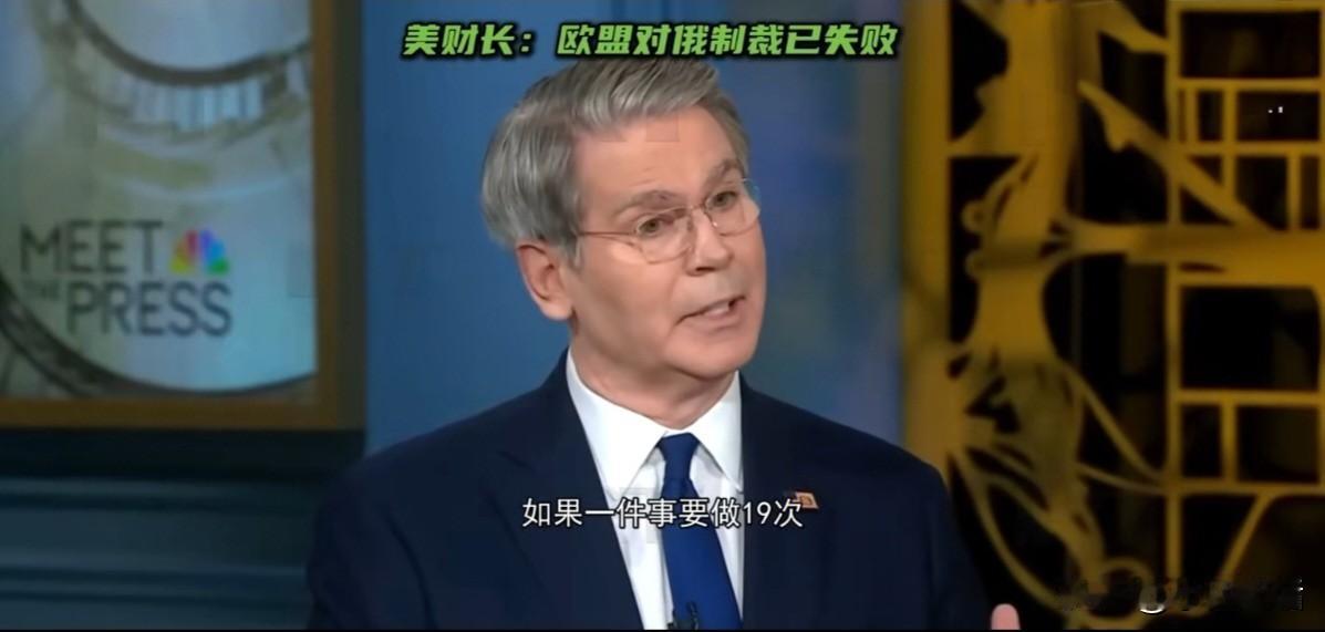 一语中的! 来自今日俄罗斯(RT)的消息,11月23日,美国财政部长贝森特在接受NBC新闻采访时表示,欧盟官员向他通报计划推出新一轮对俄制裁。他表示:“在我看来,如果一件事要做19次,那说明你已经失败了”。 小民闲话:欧盟官员就是一群“掩耳盗铃的戏精”,贝森特毫不留情面的揭开了他们的面具,这让欧盟官员情何以堪!